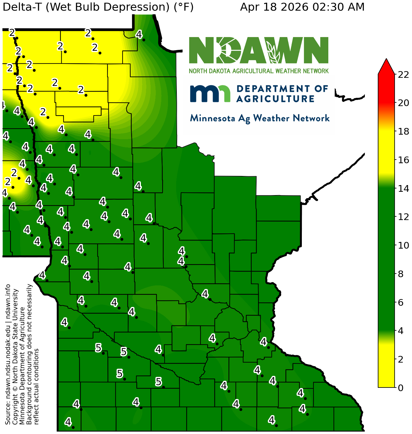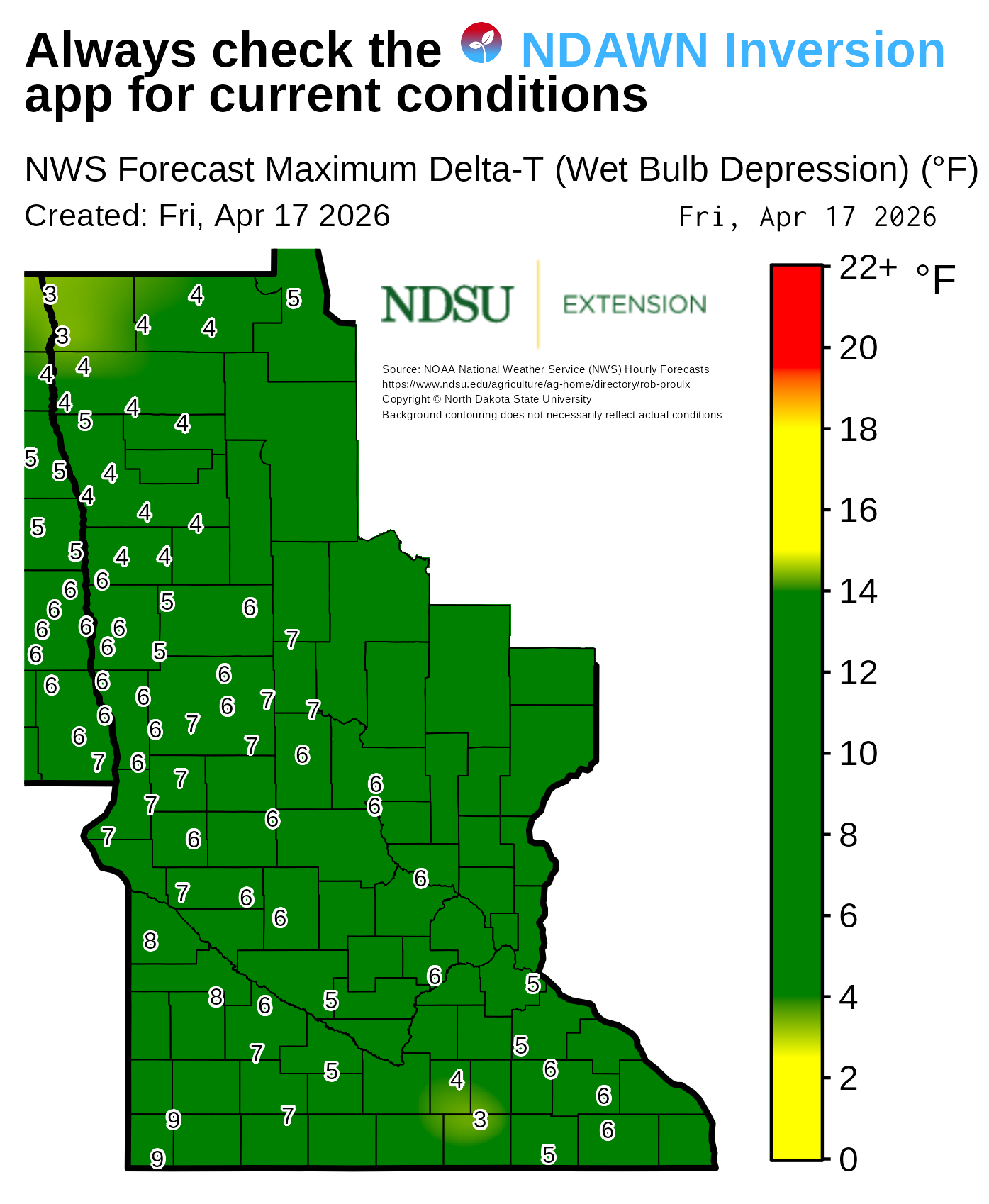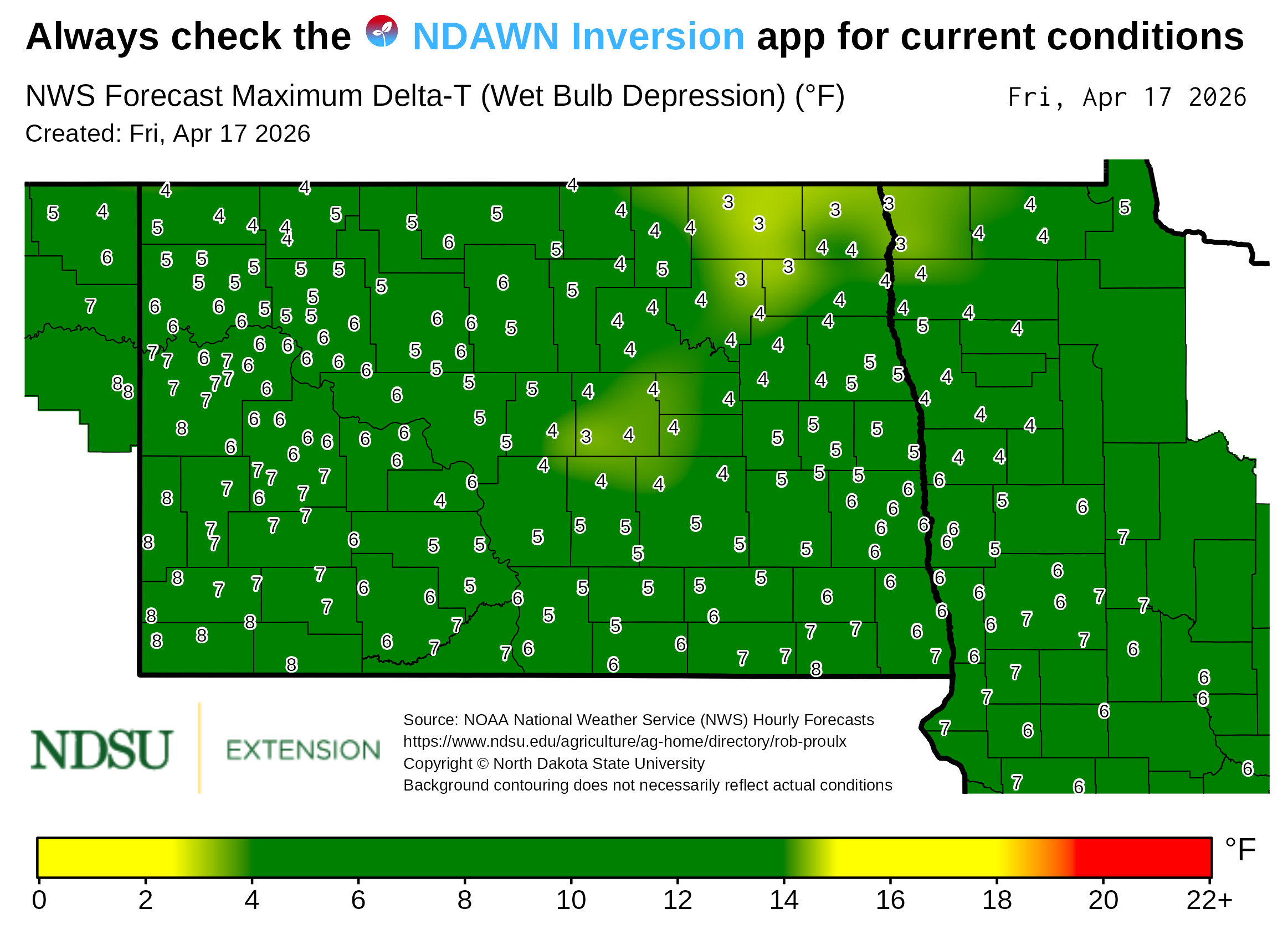 Delta T is just one weather variable to consider before spraying. Check the NDAWN Inversion app for the latest temperature, wind conditions, Delta T, and inversion alert for your location.