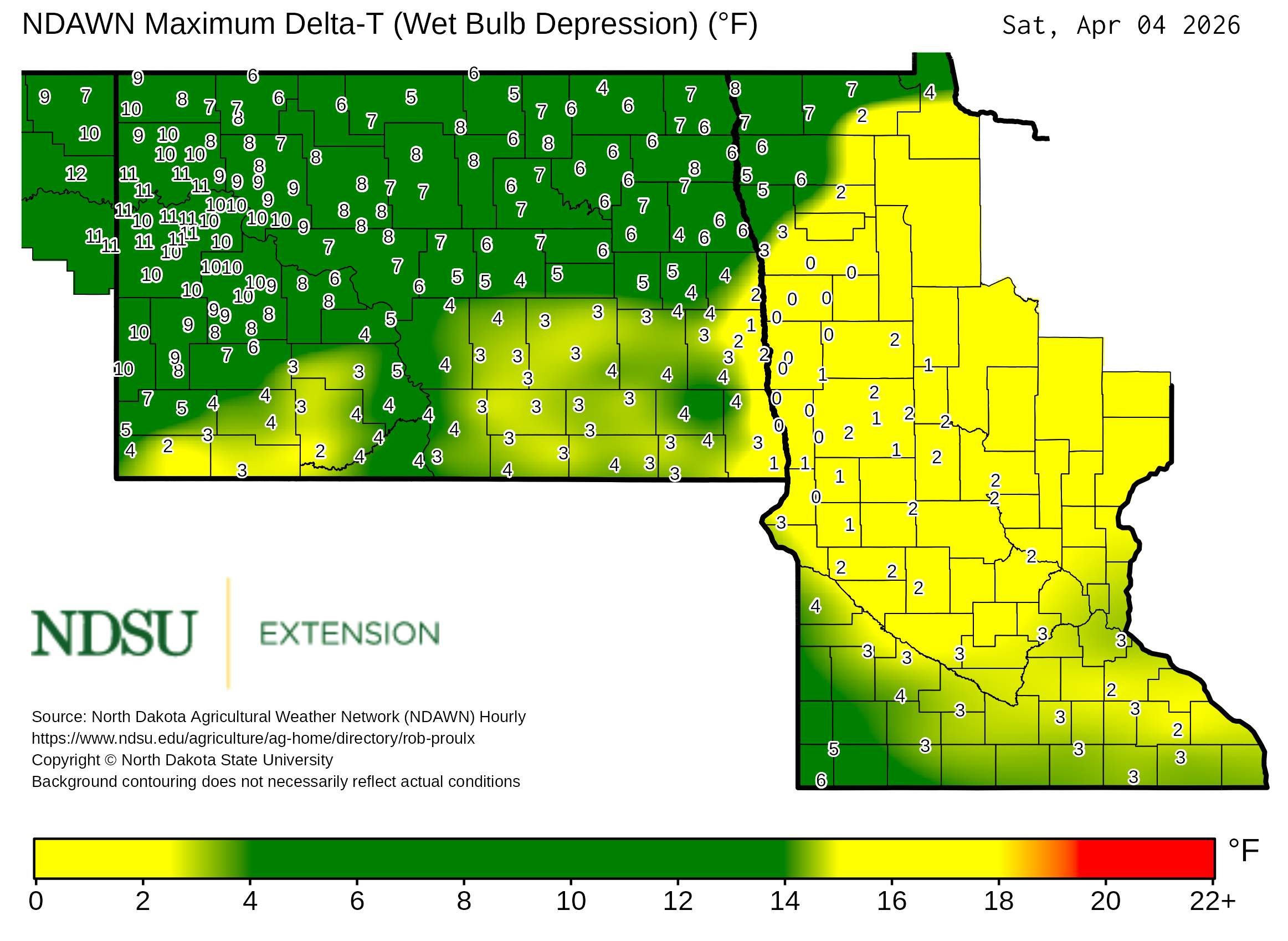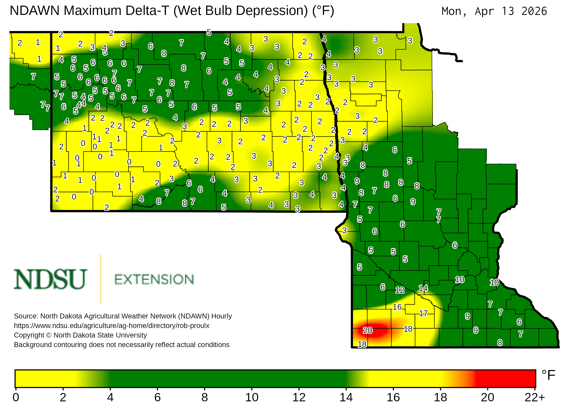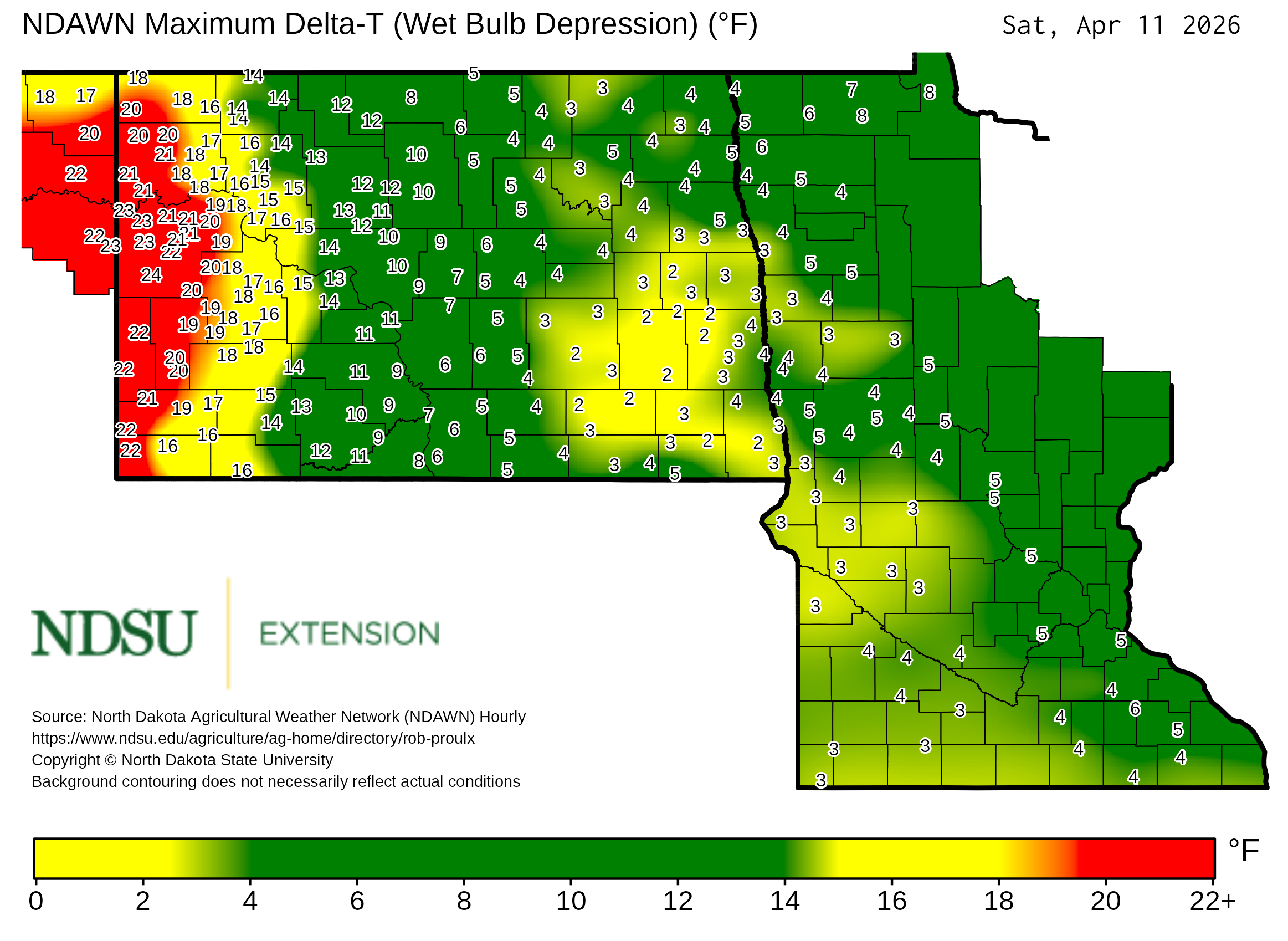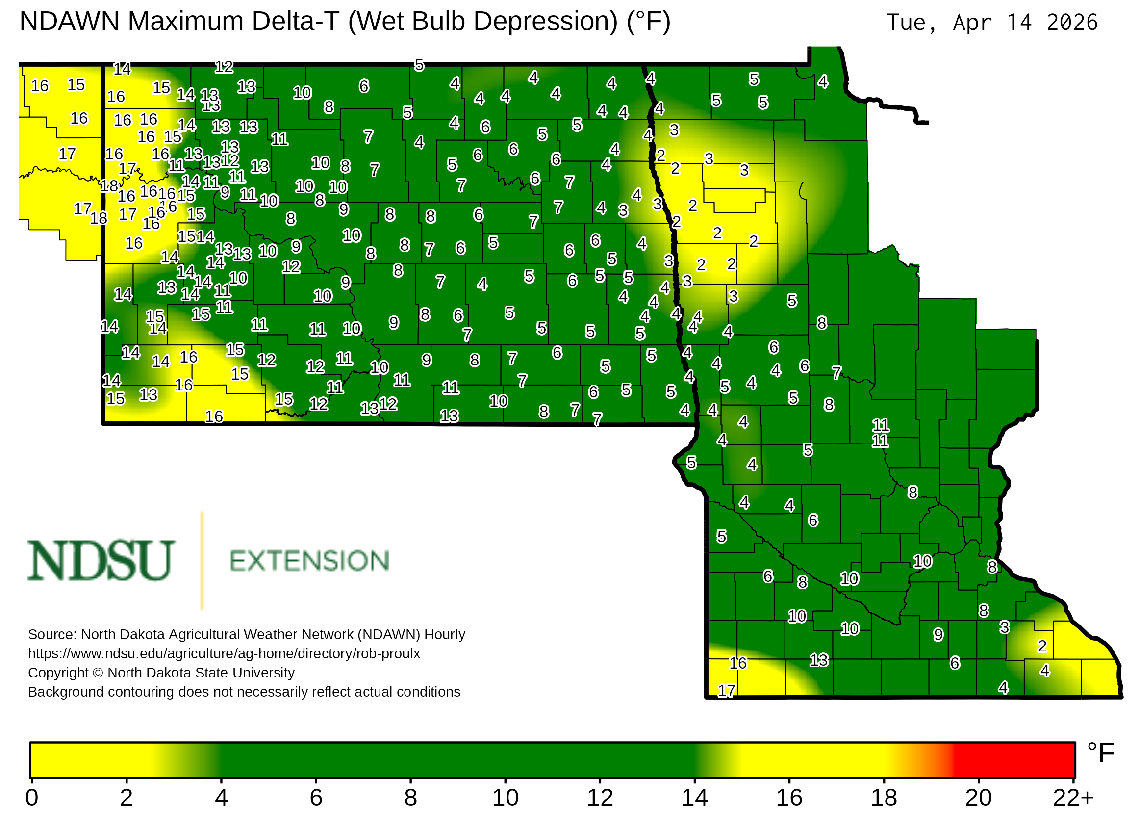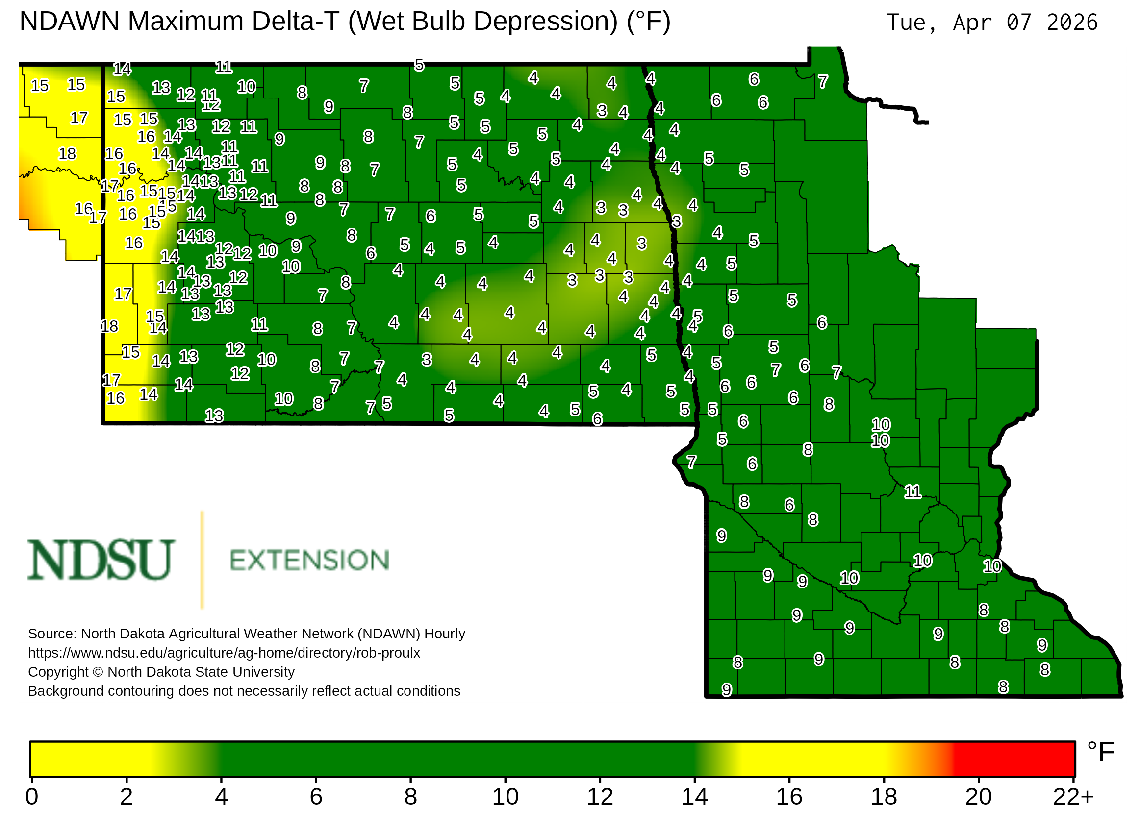 Historical maximum Delta T derived from North Dakota Agricultural Weather Network hourly data, which is available at