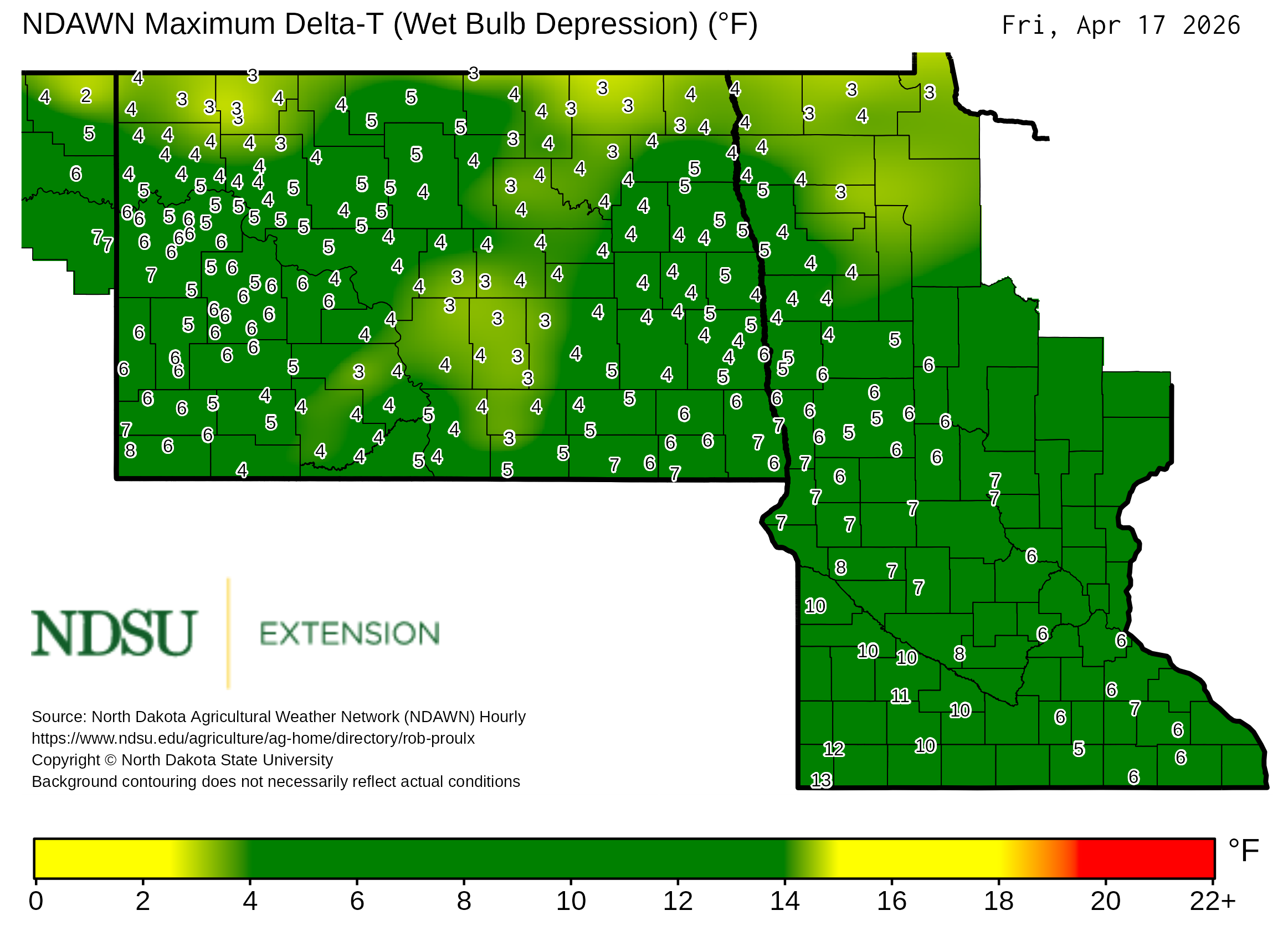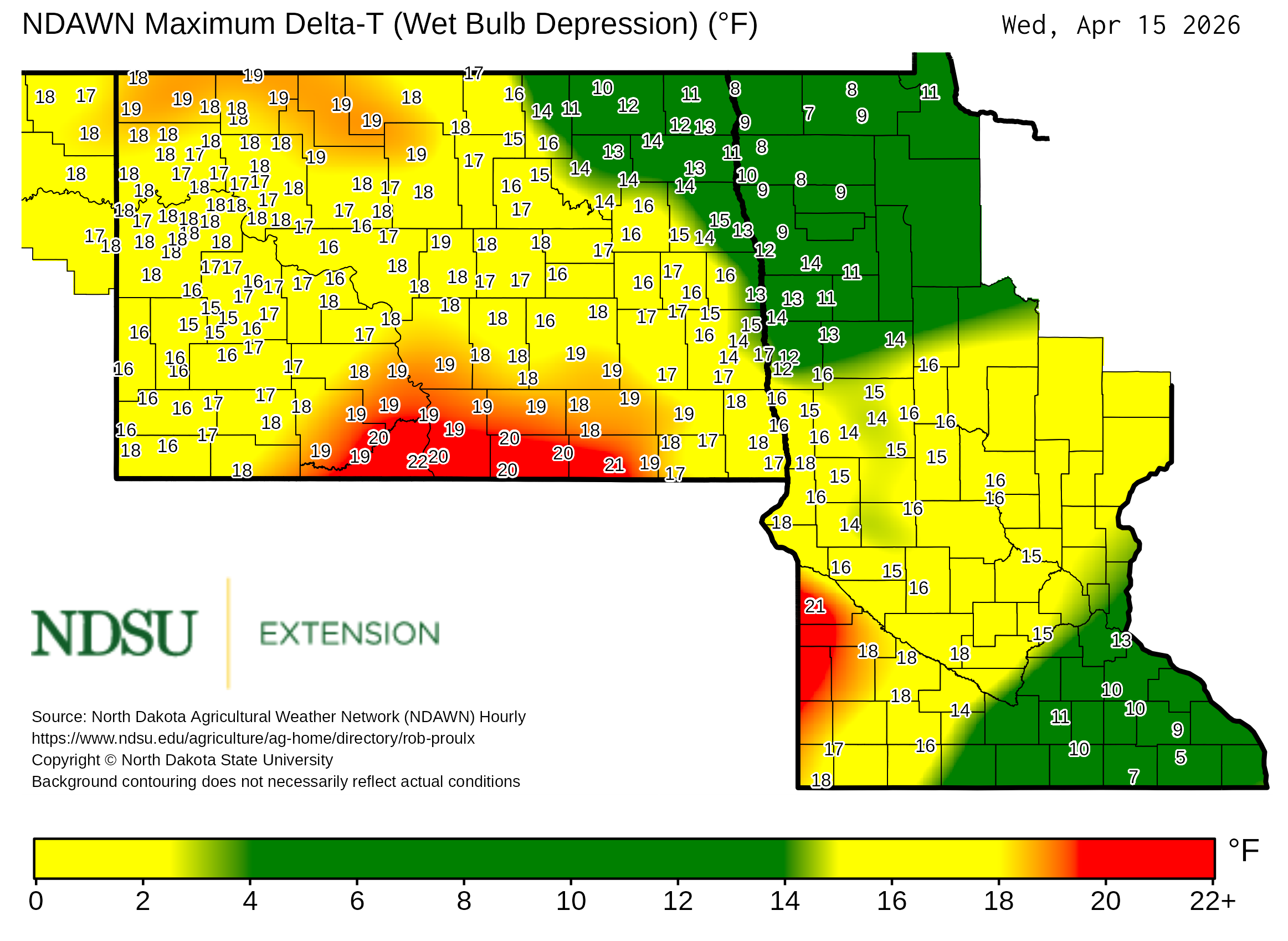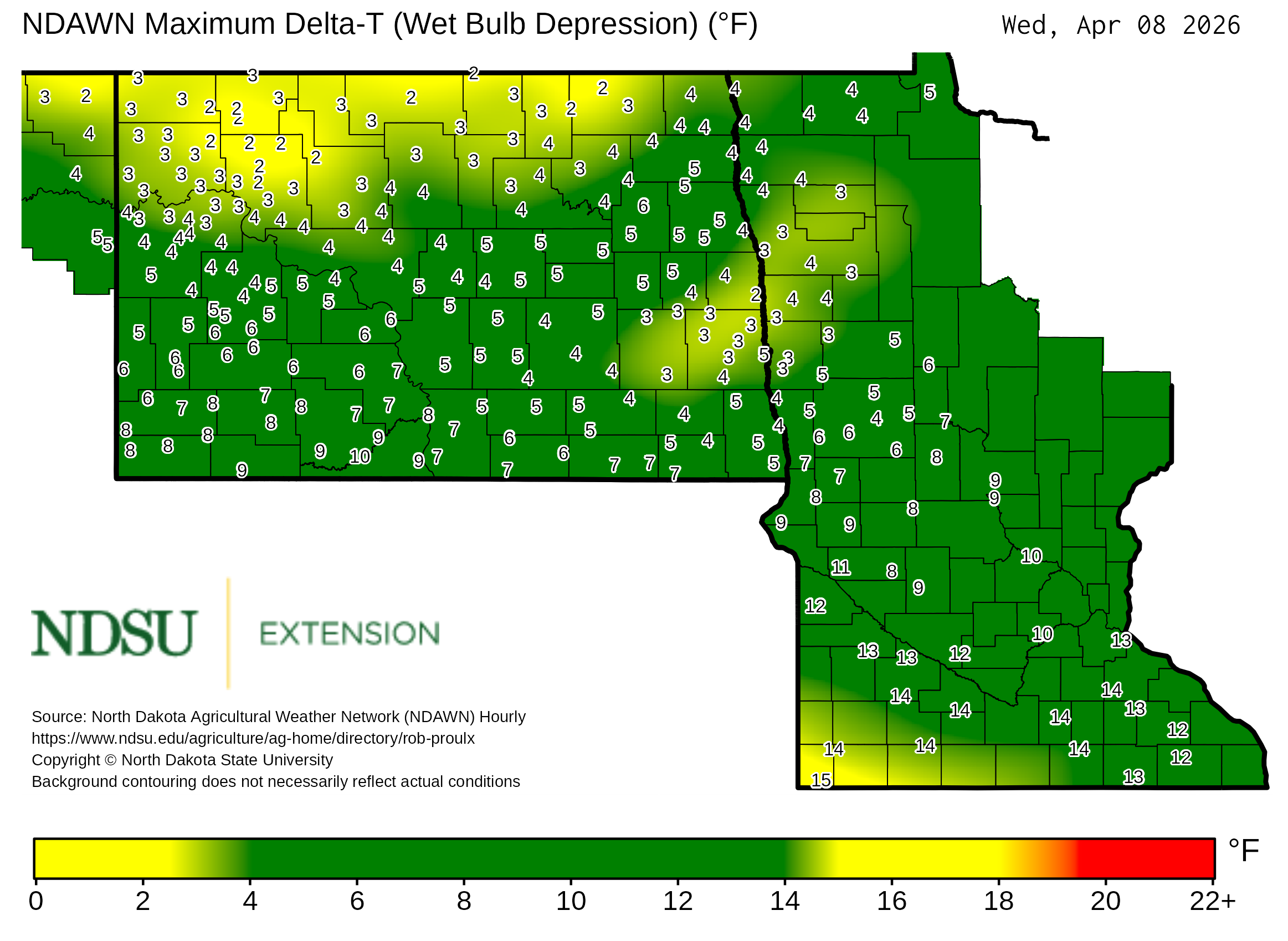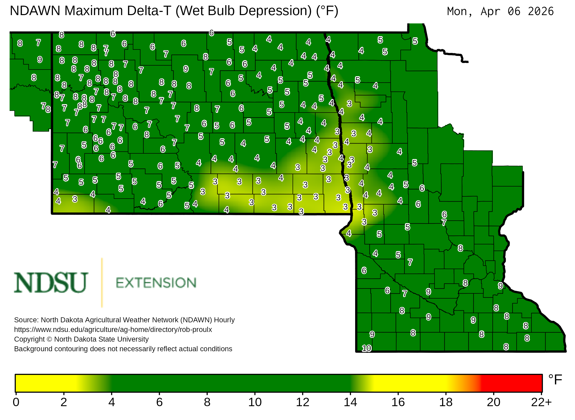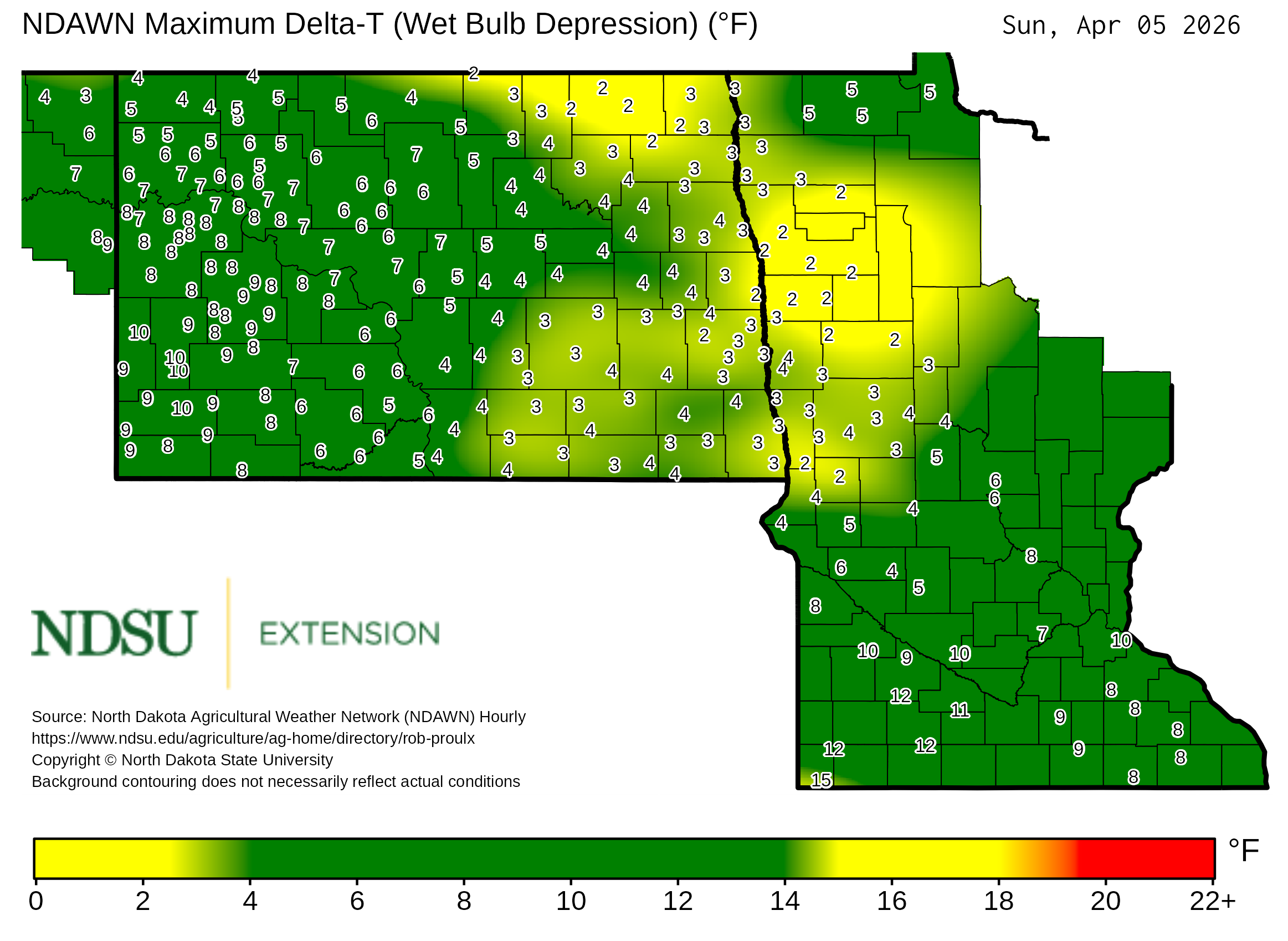 Historical maximum Delta T derived from North Dakota Agricultural Weather Network hourly data, which is available at