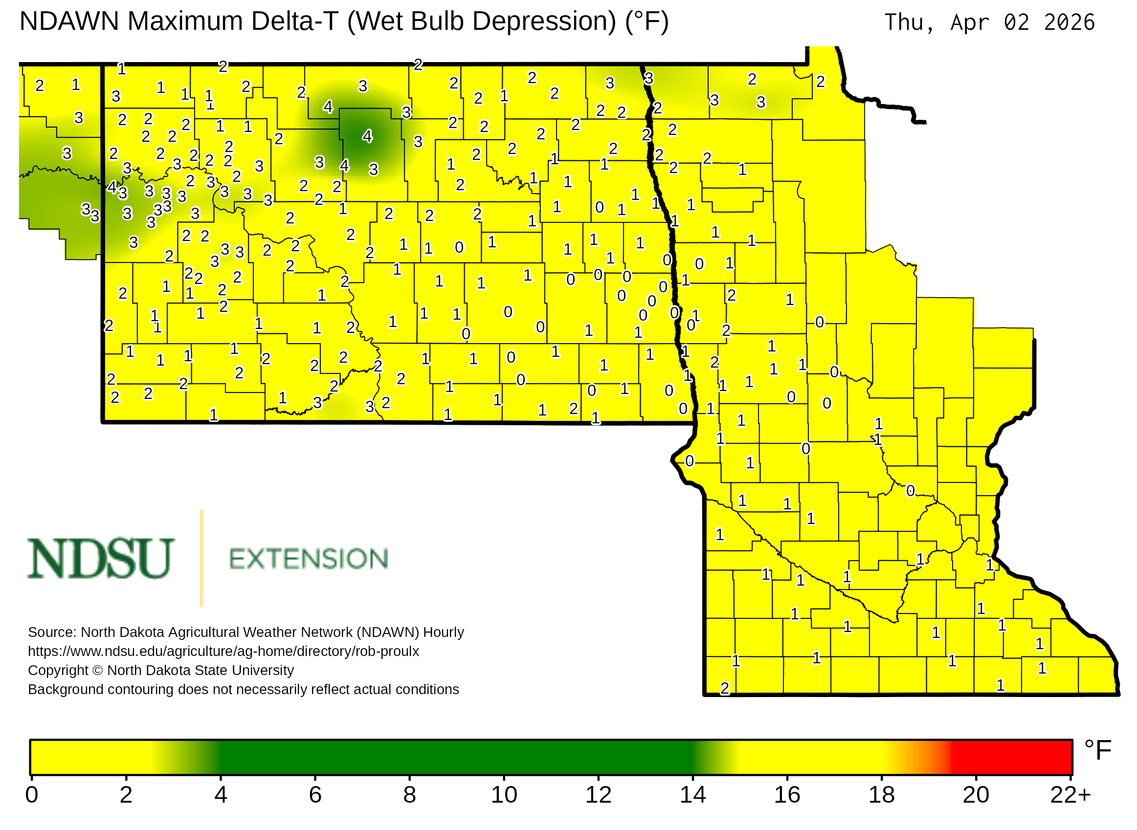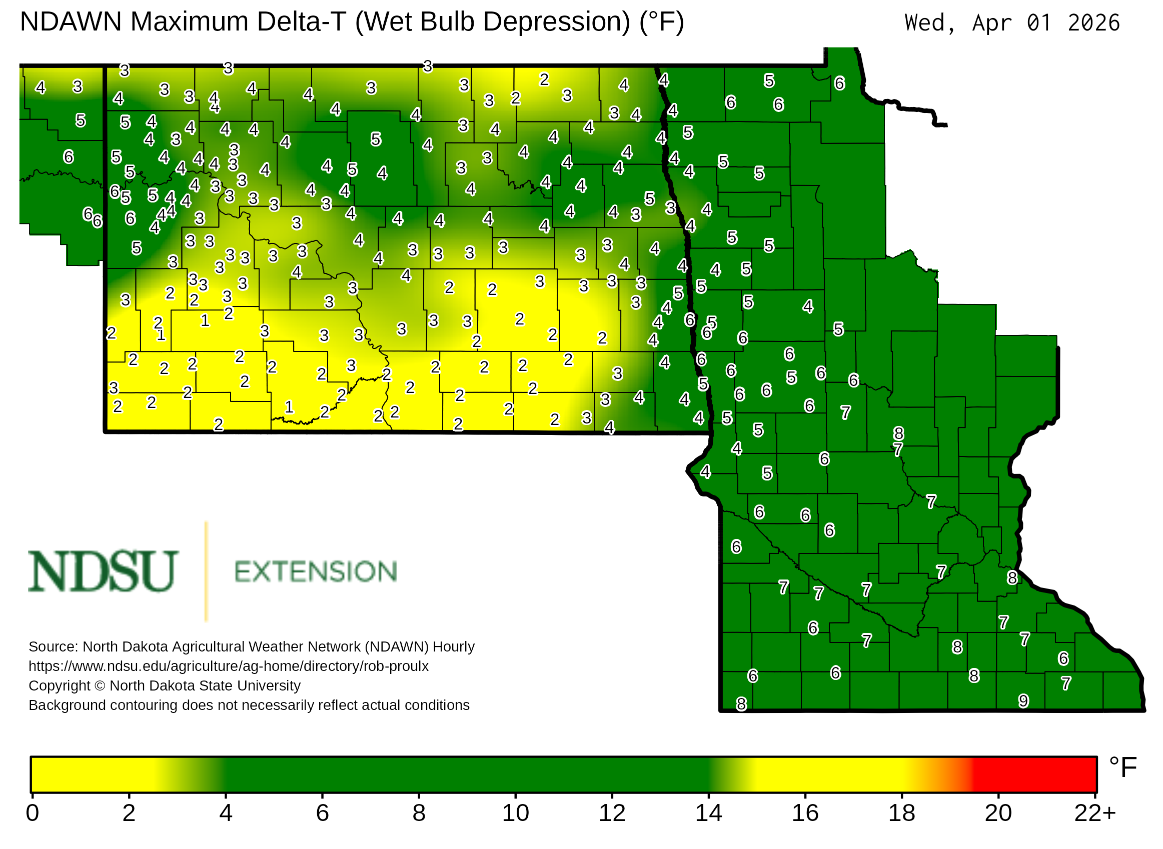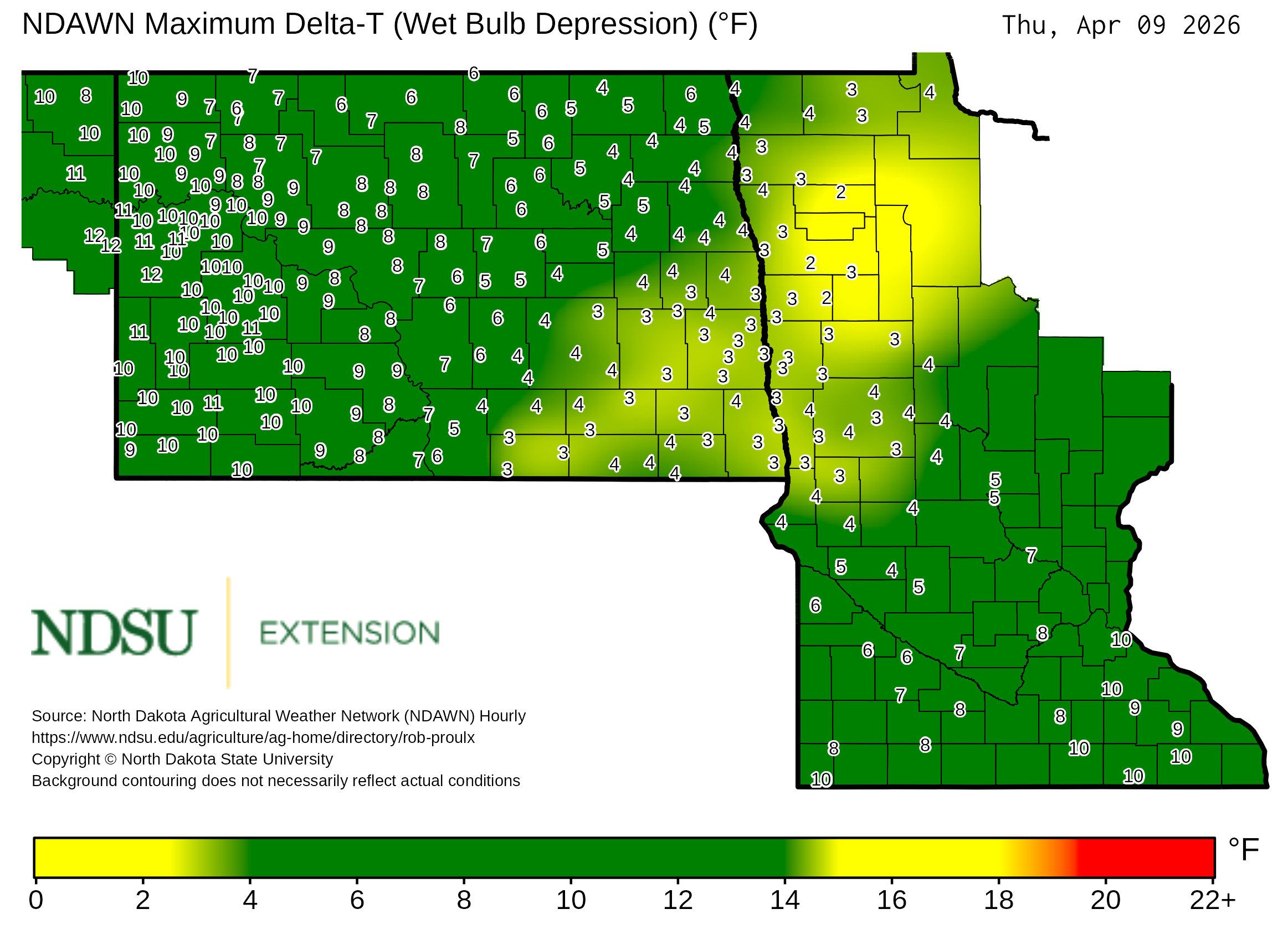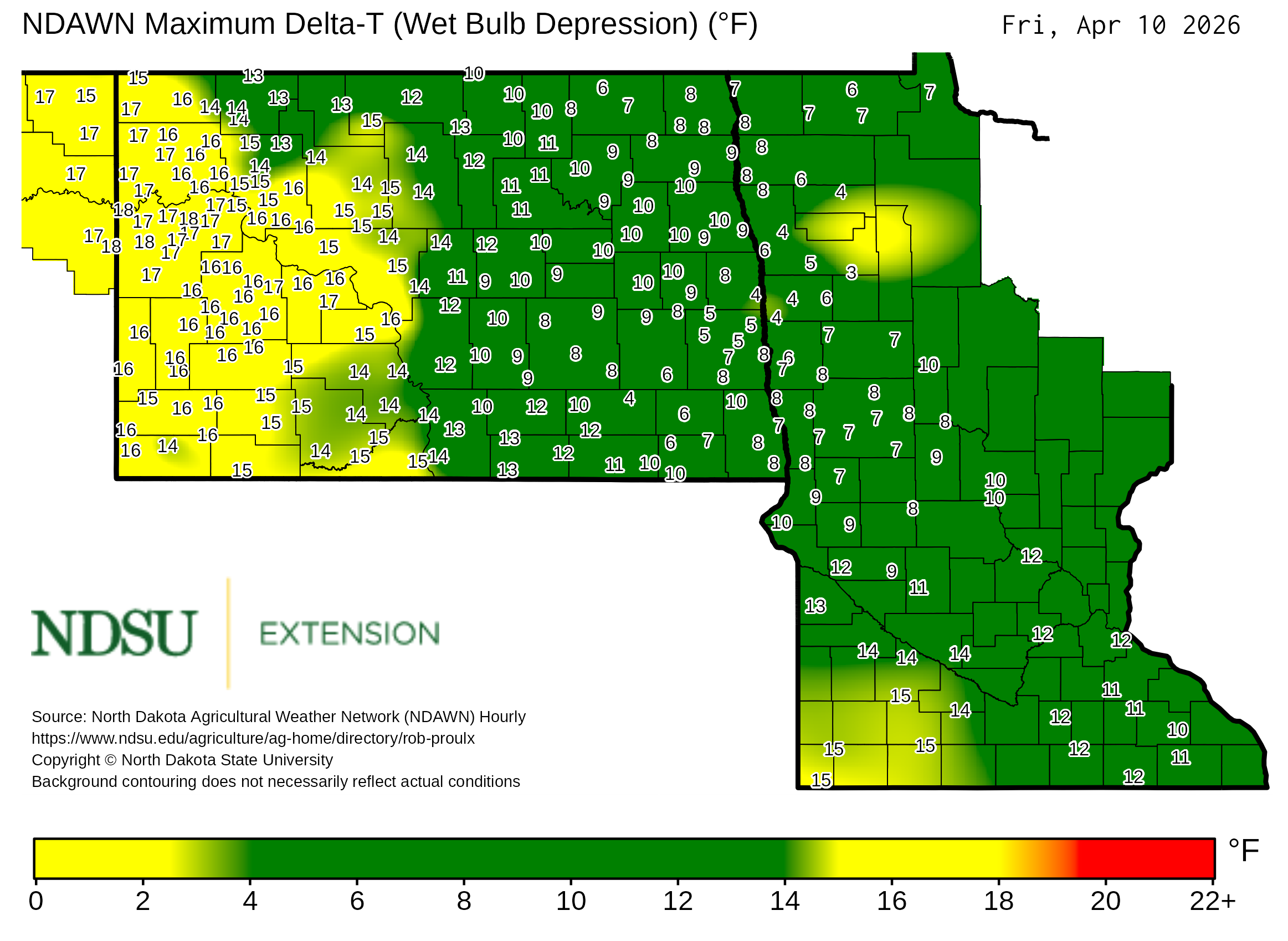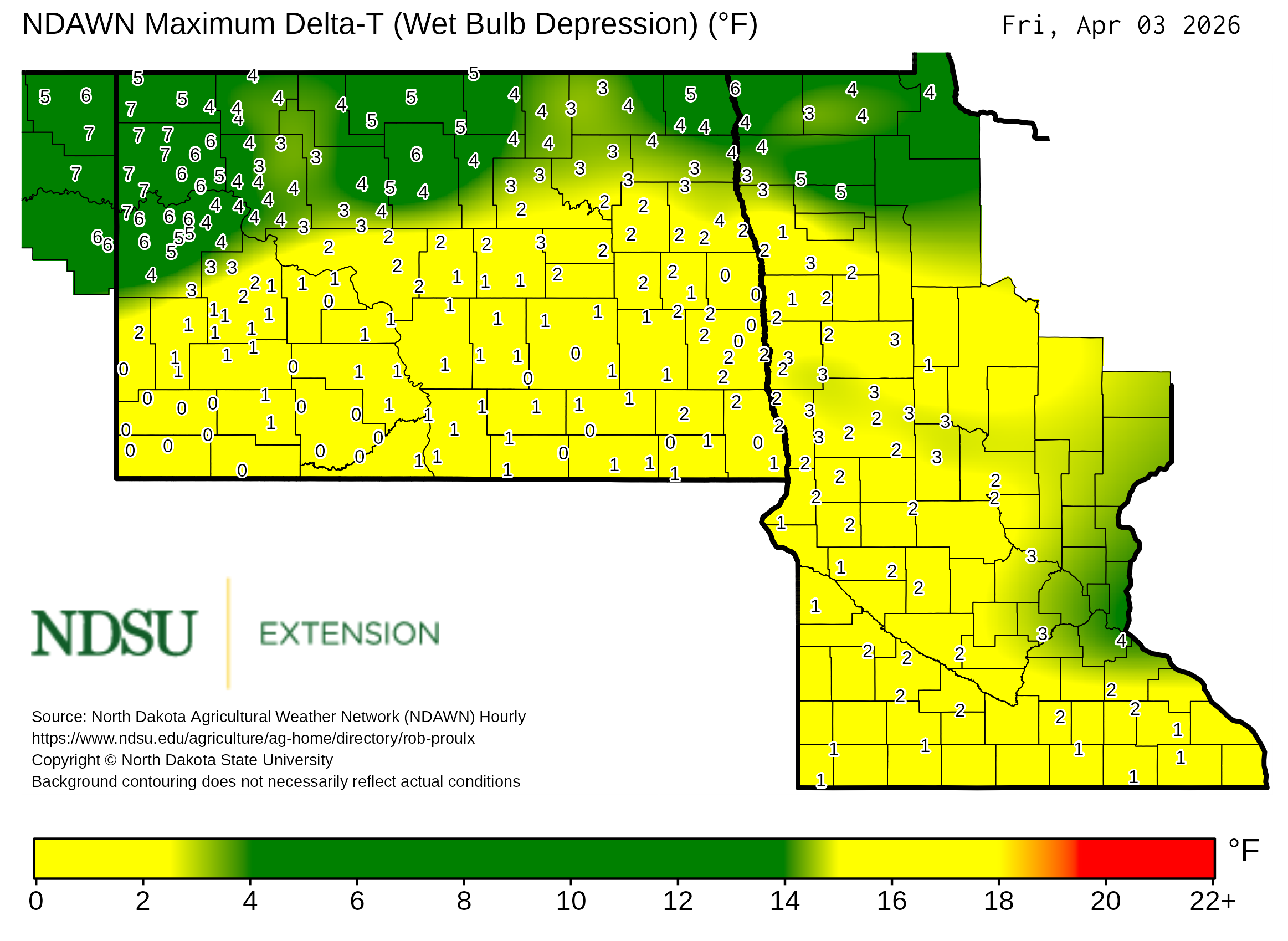Historical maximum Delta T derived from North Dakota Agricultural Weather Network hourly data, which is available at