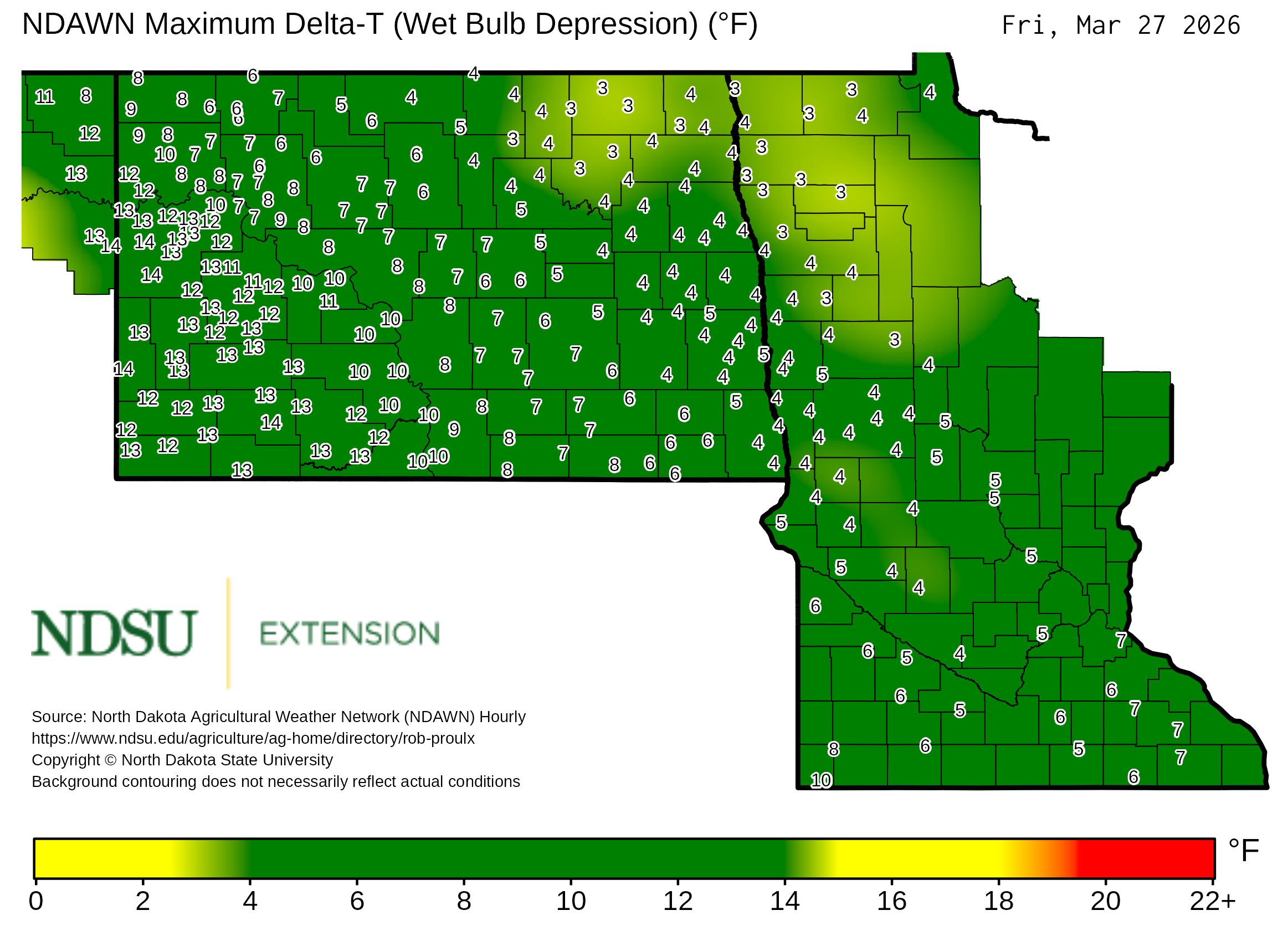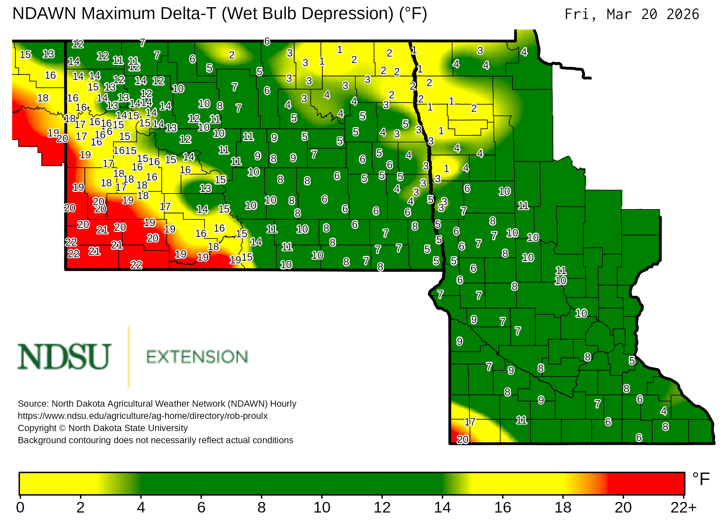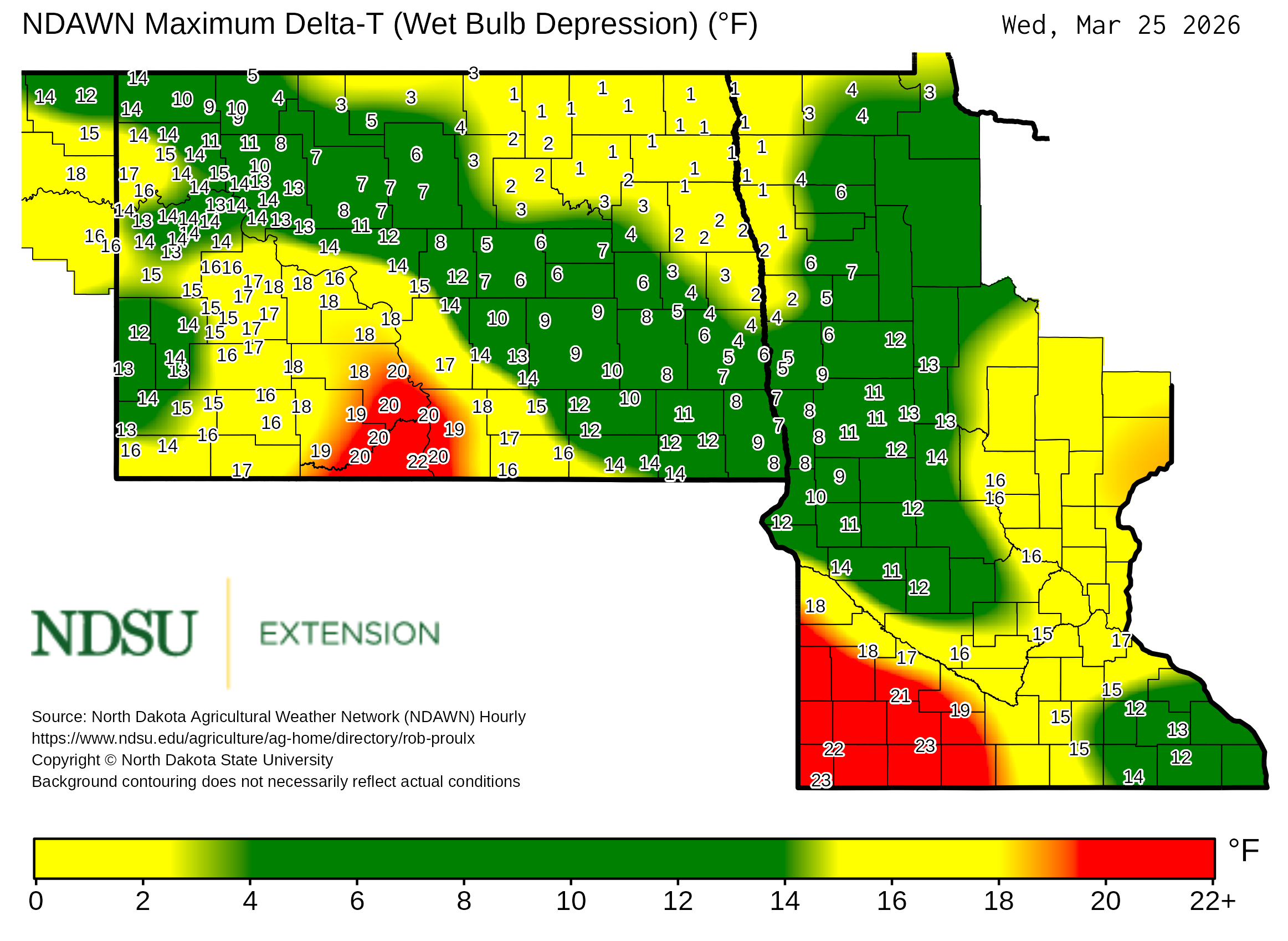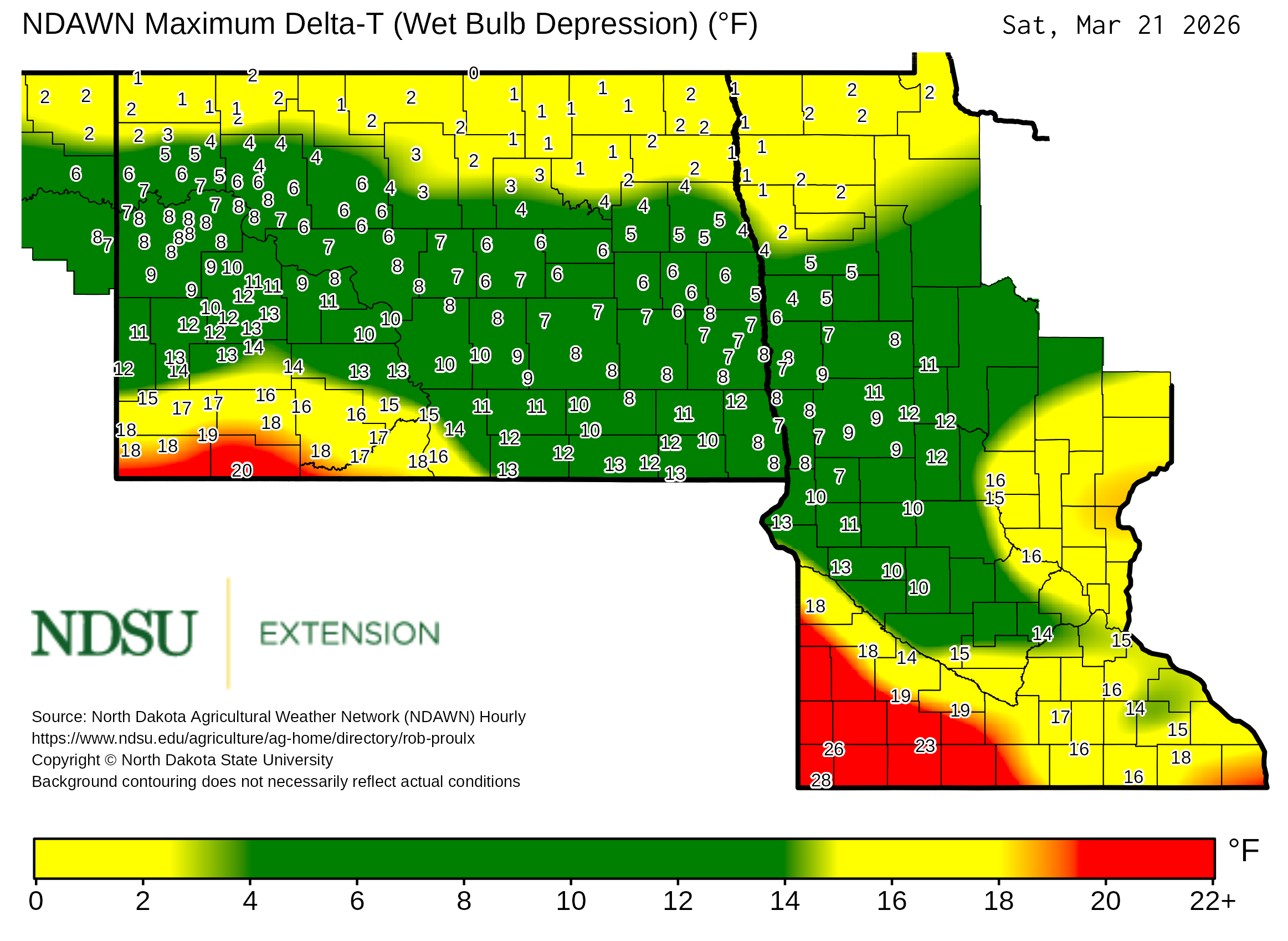 Historical maximum Delta T derived from North Dakota Agricultural Weather Network hourly data, which is available at