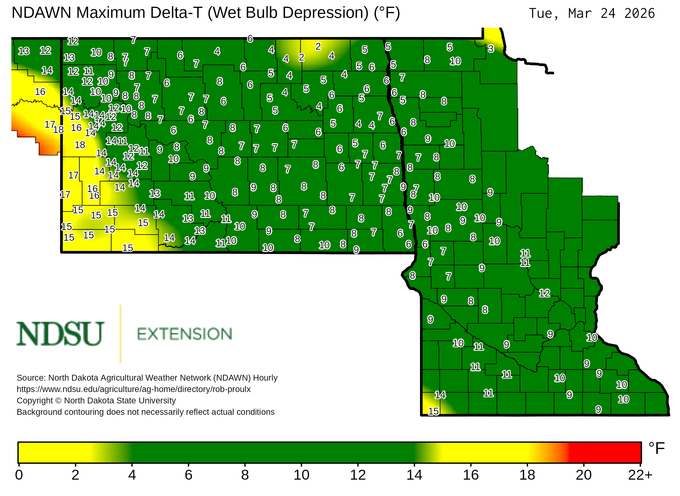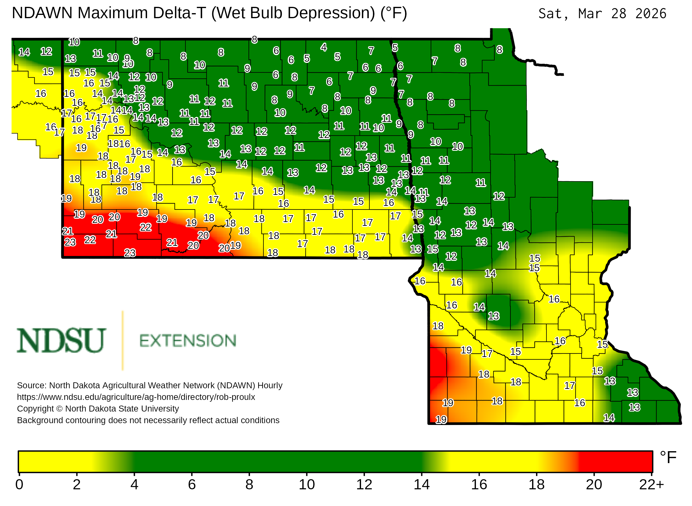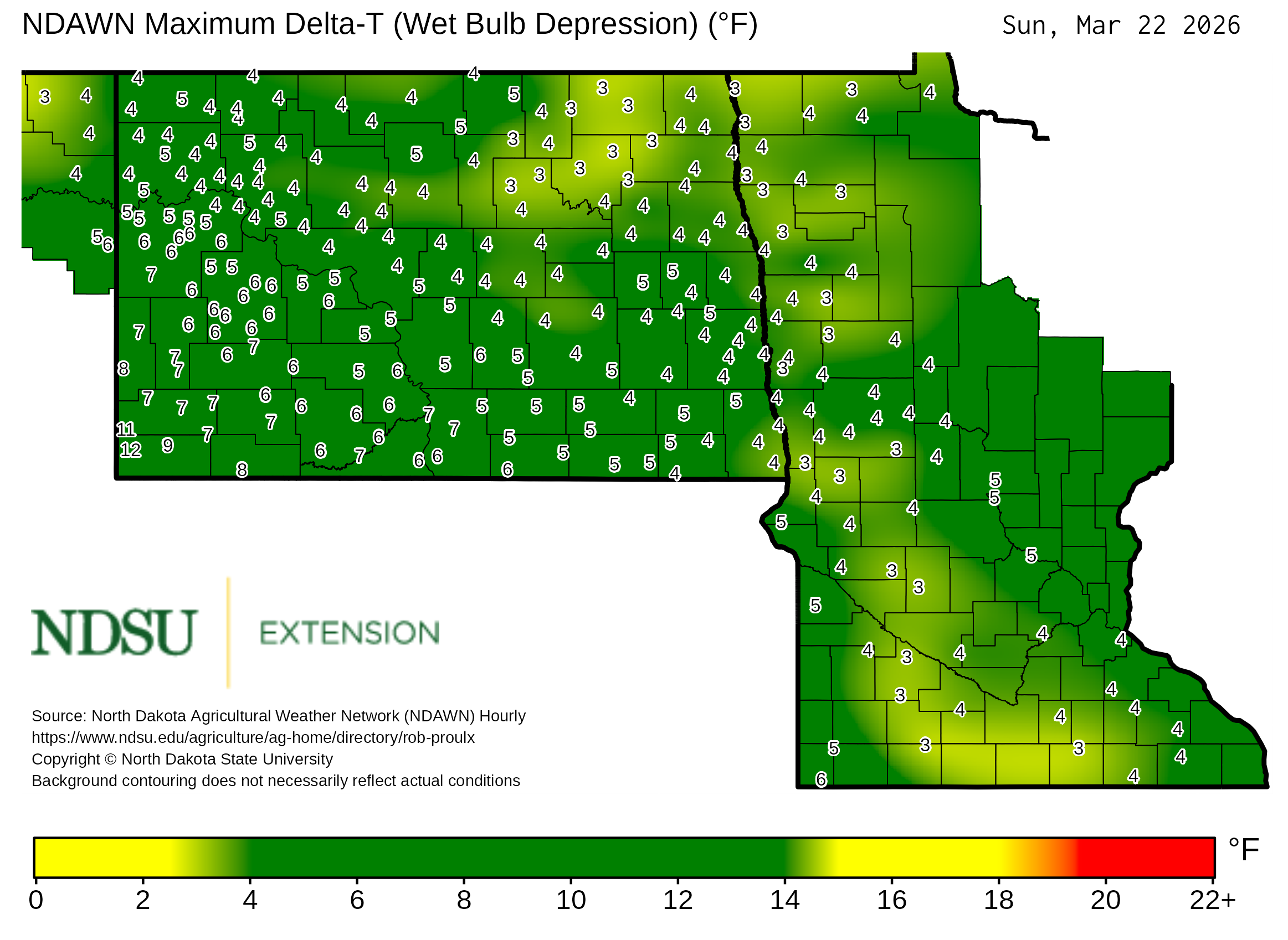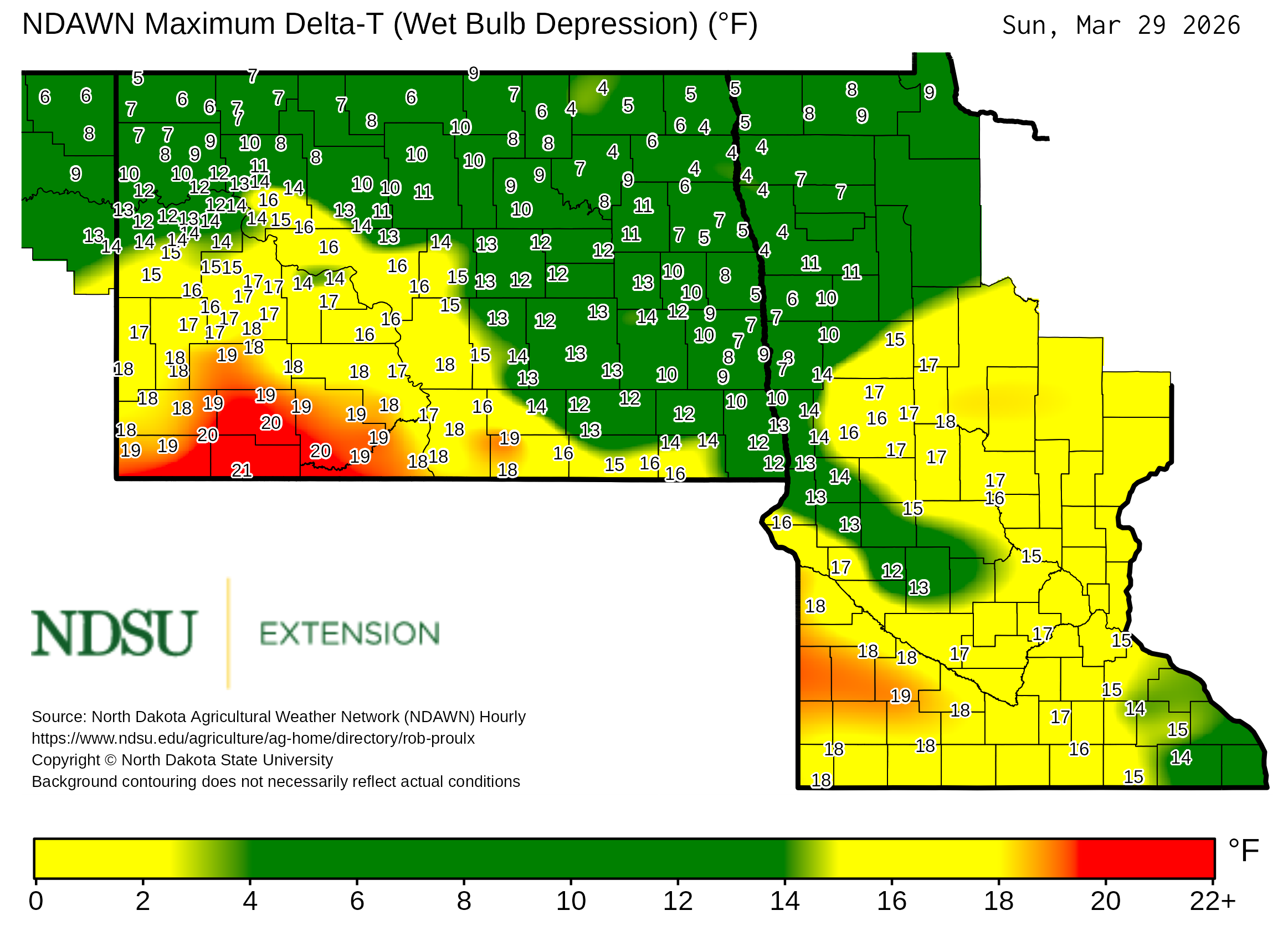 Historical maximum Delta T derived from North Dakota Agricultural Weather Network hourly data, which is available at