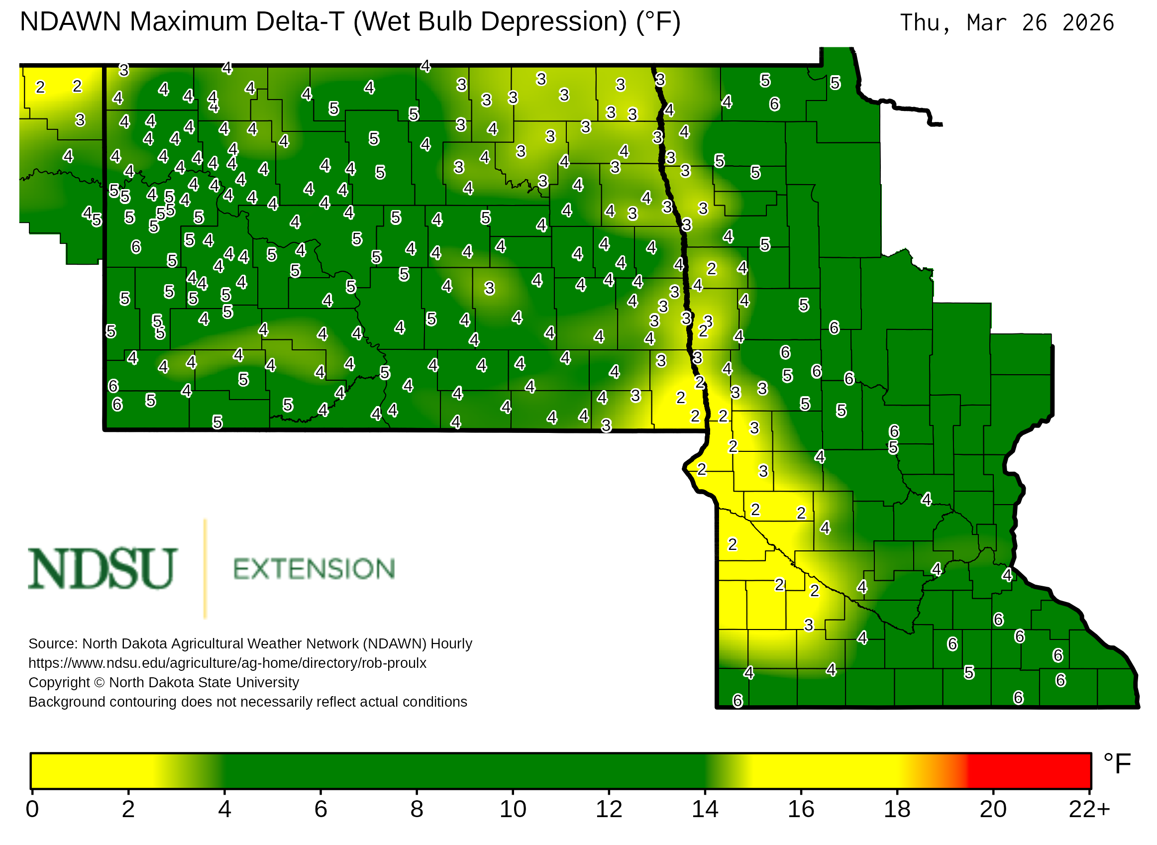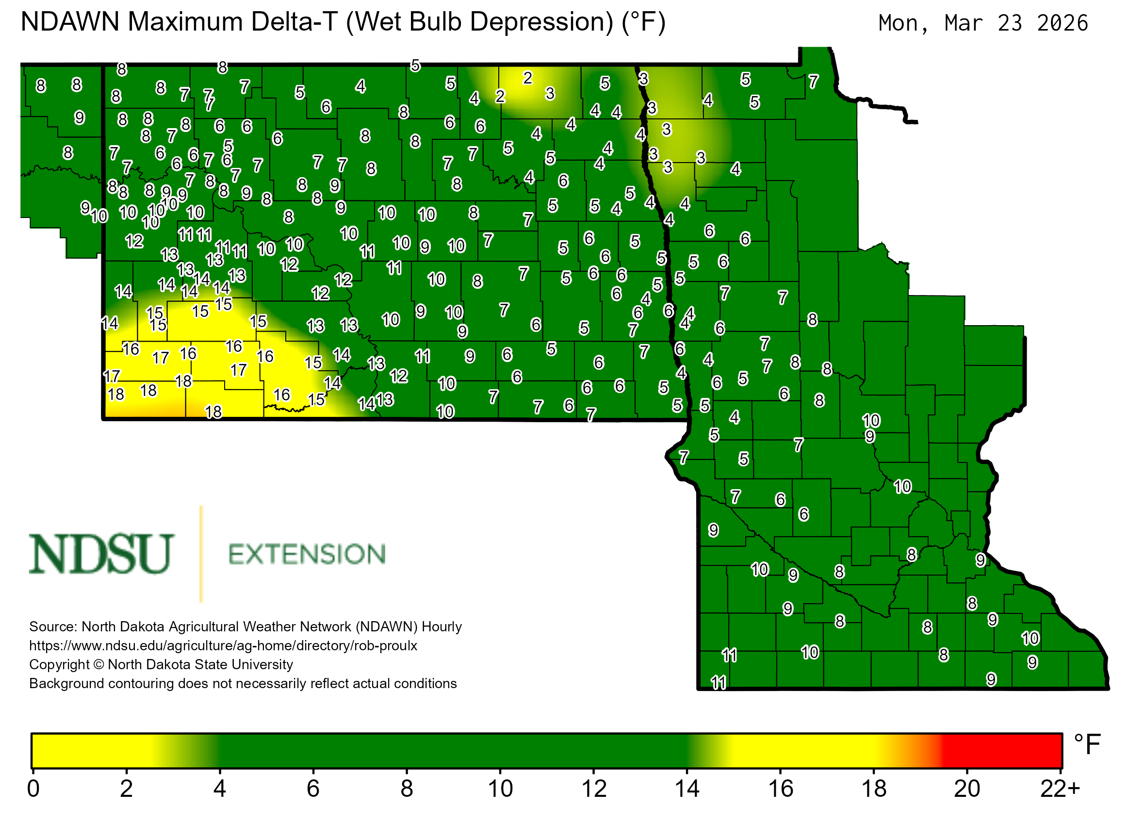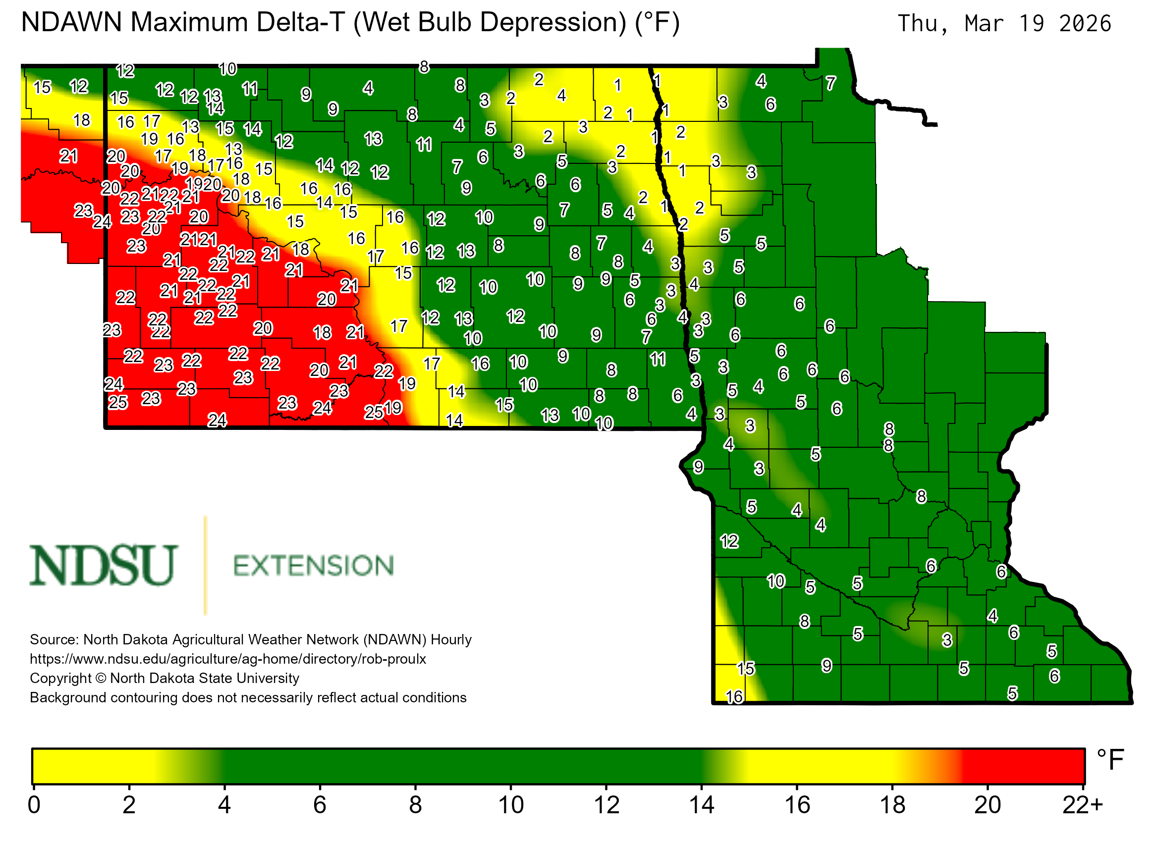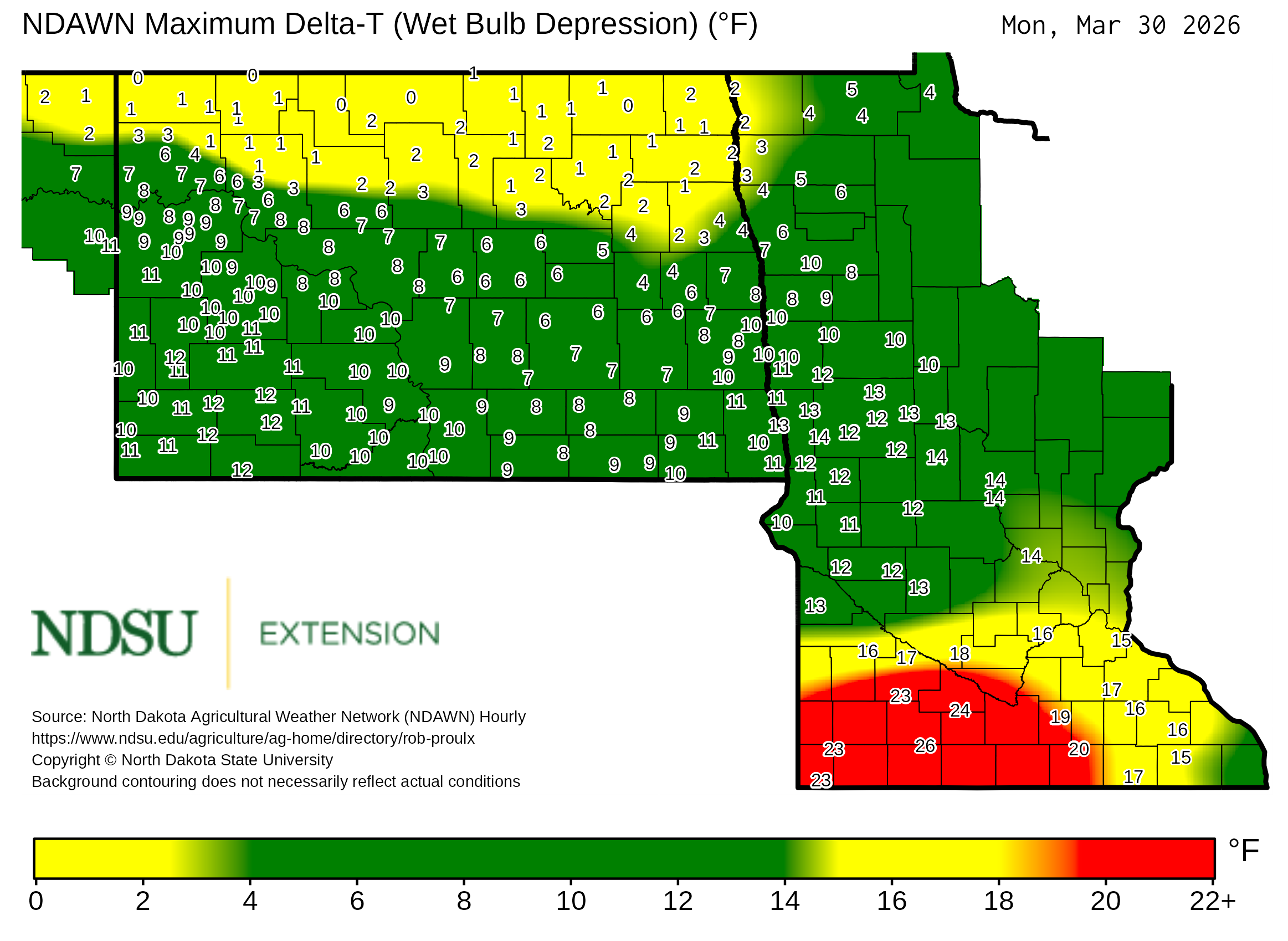 Historical maximum Delta T derived from North Dakota Agricultural Weather Network hourly data, which is available at