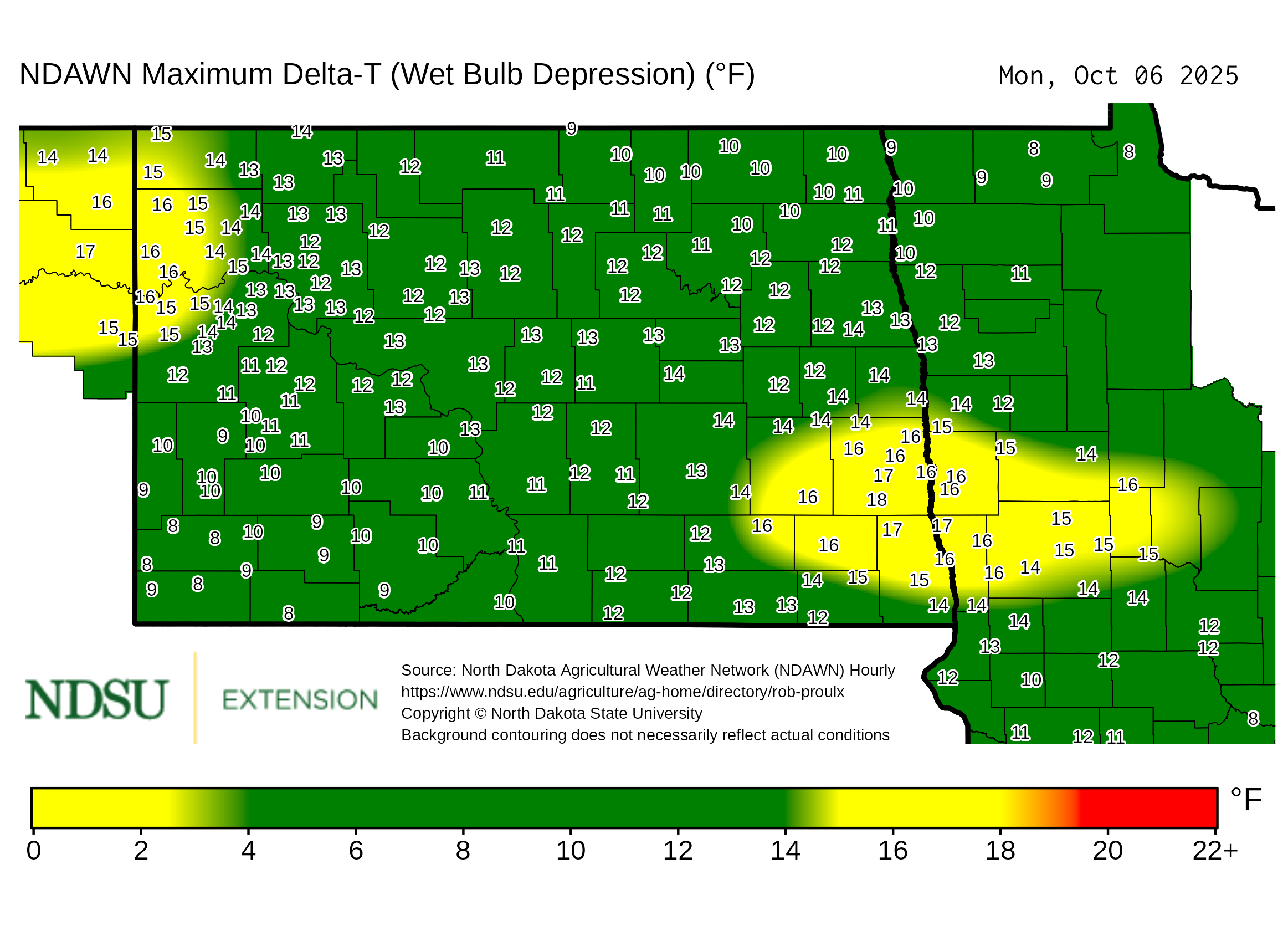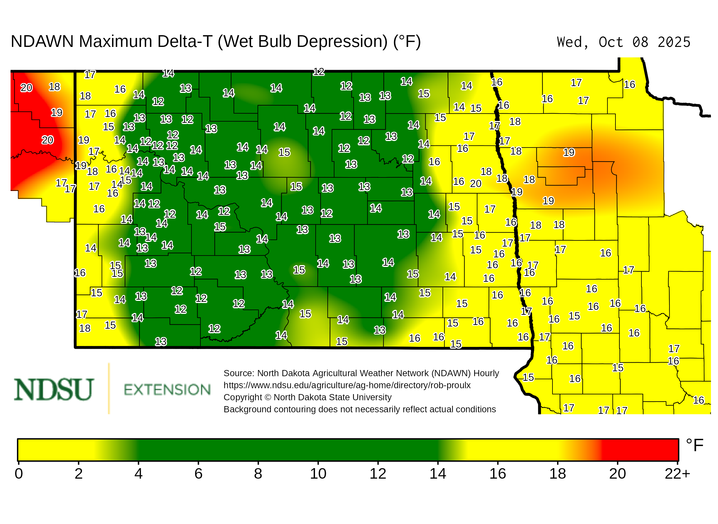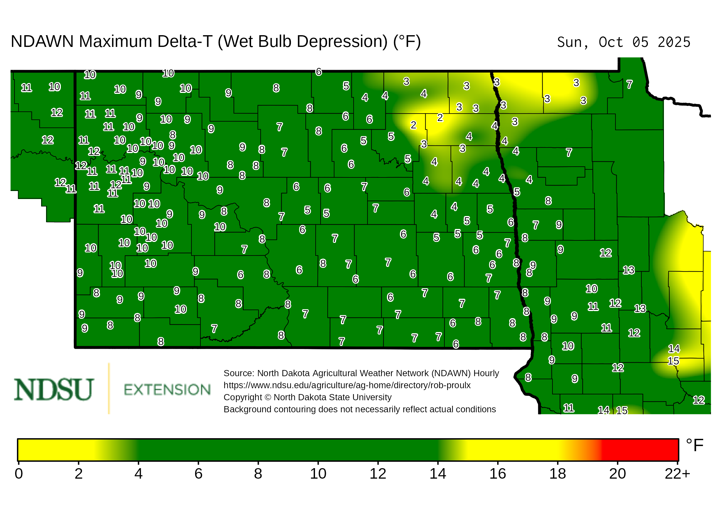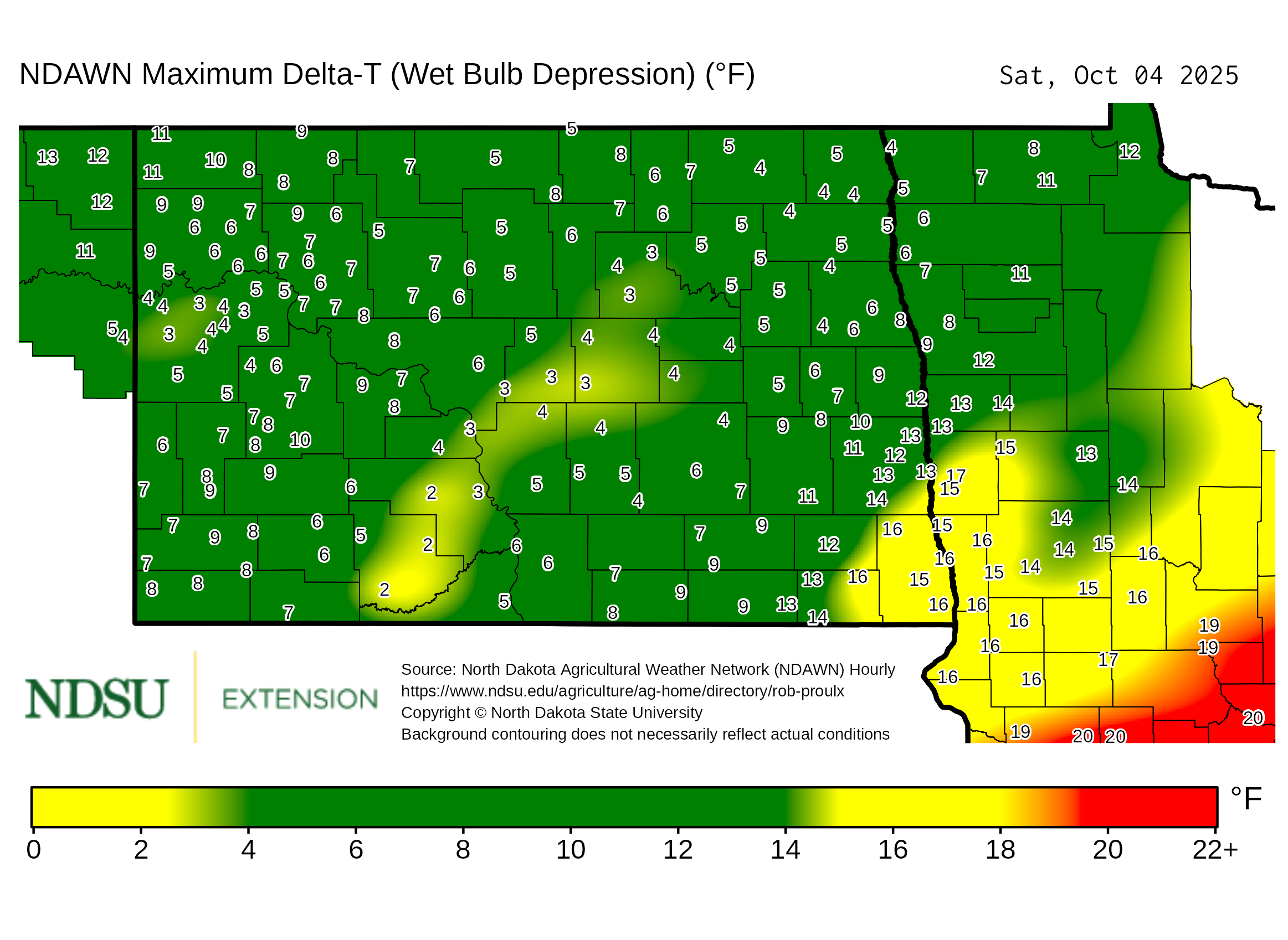 Historical maximum Delta T derived from North Dakota Agricultural Weather Network hourly data, which is available at