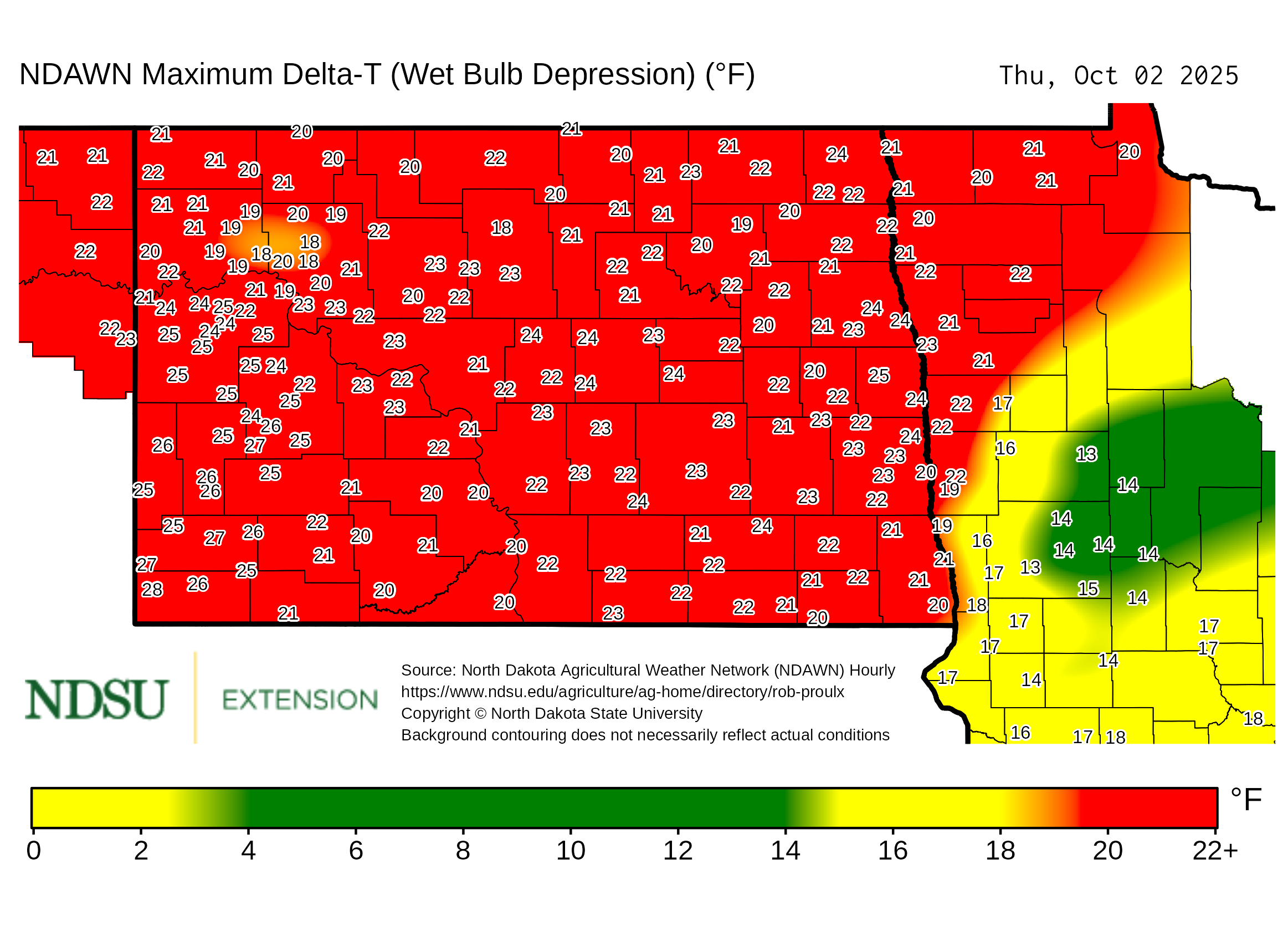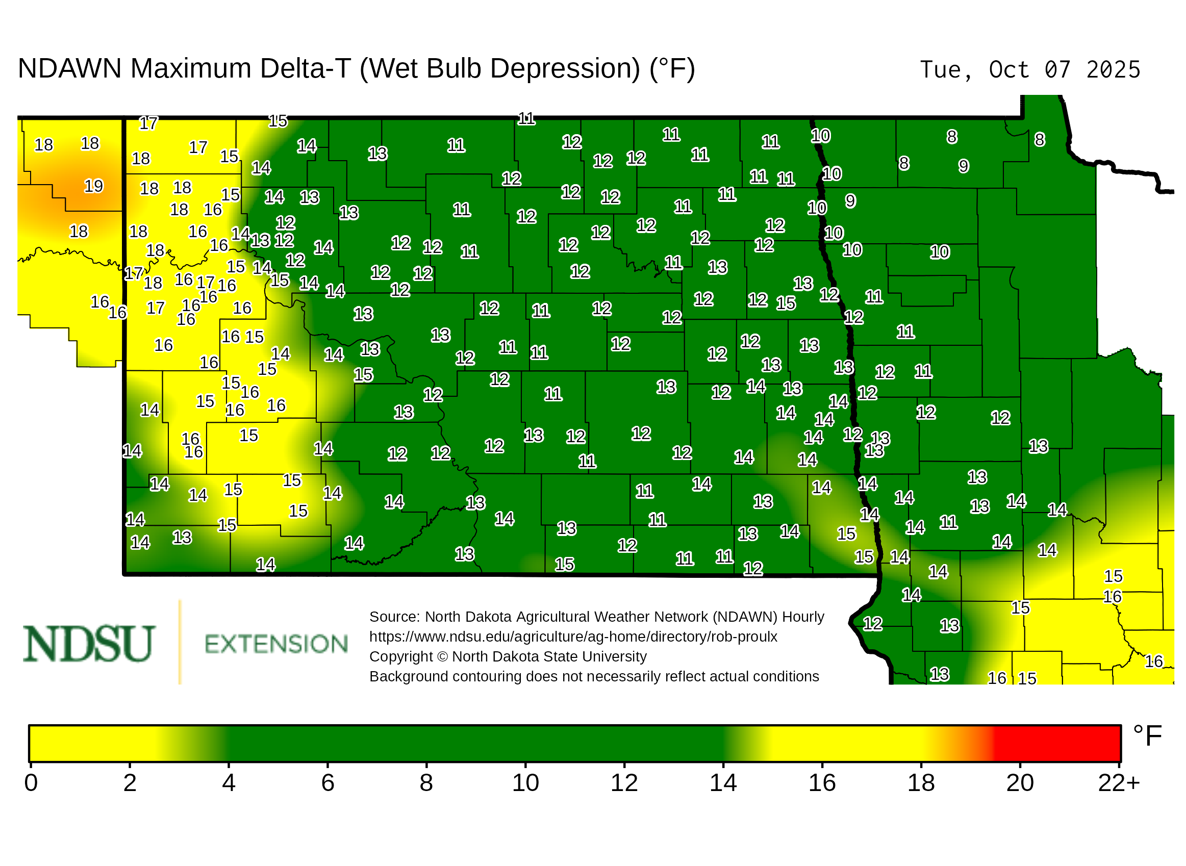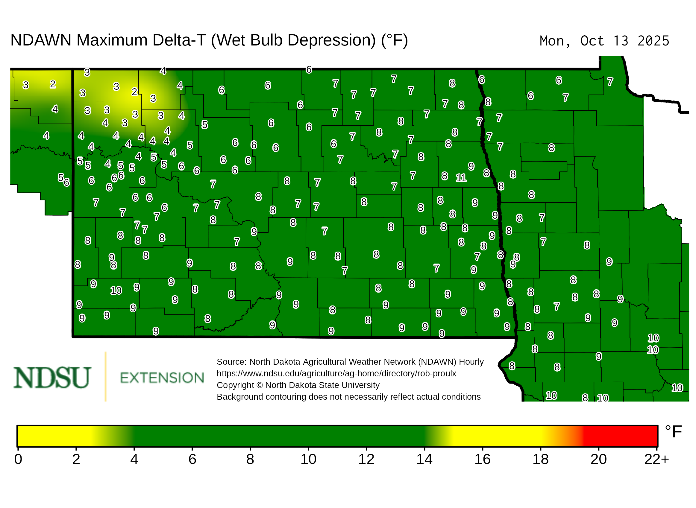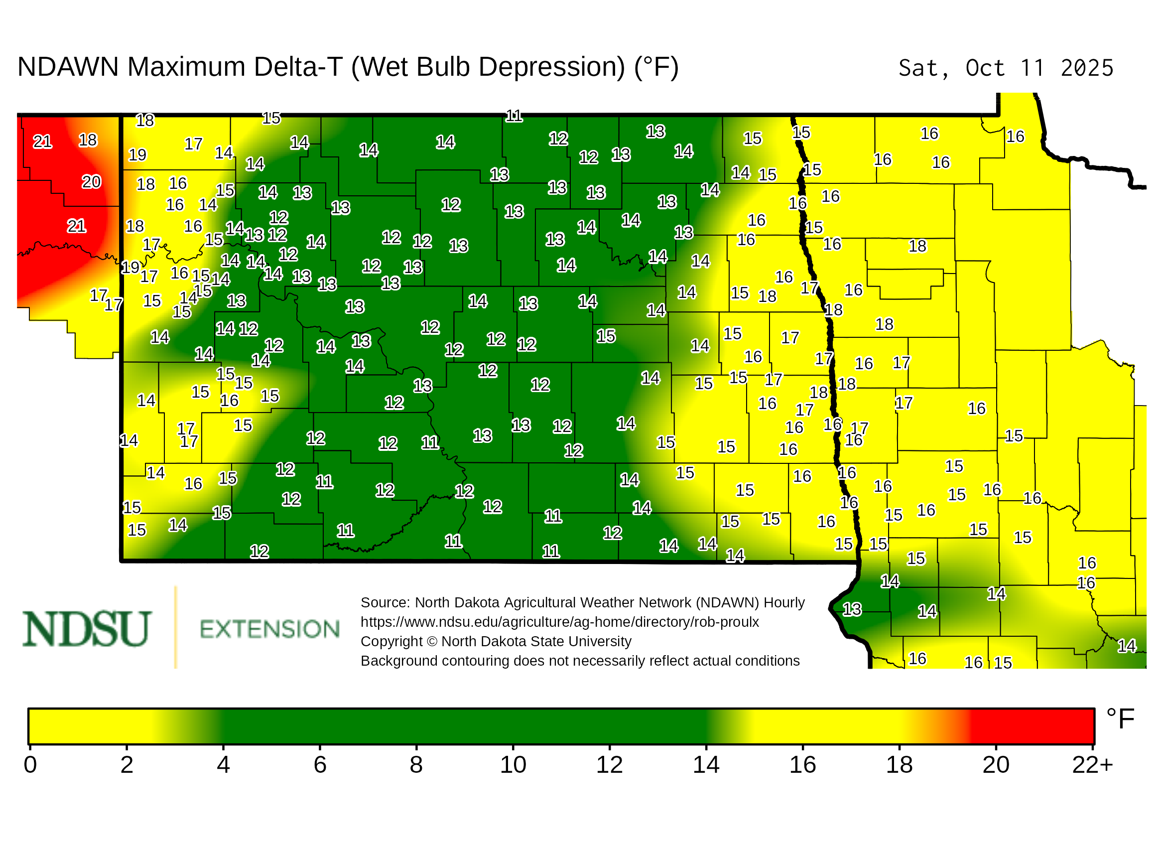 Historical maximum Delta T derived from North Dakota Agricultural Weather Network hourly data, which is available at