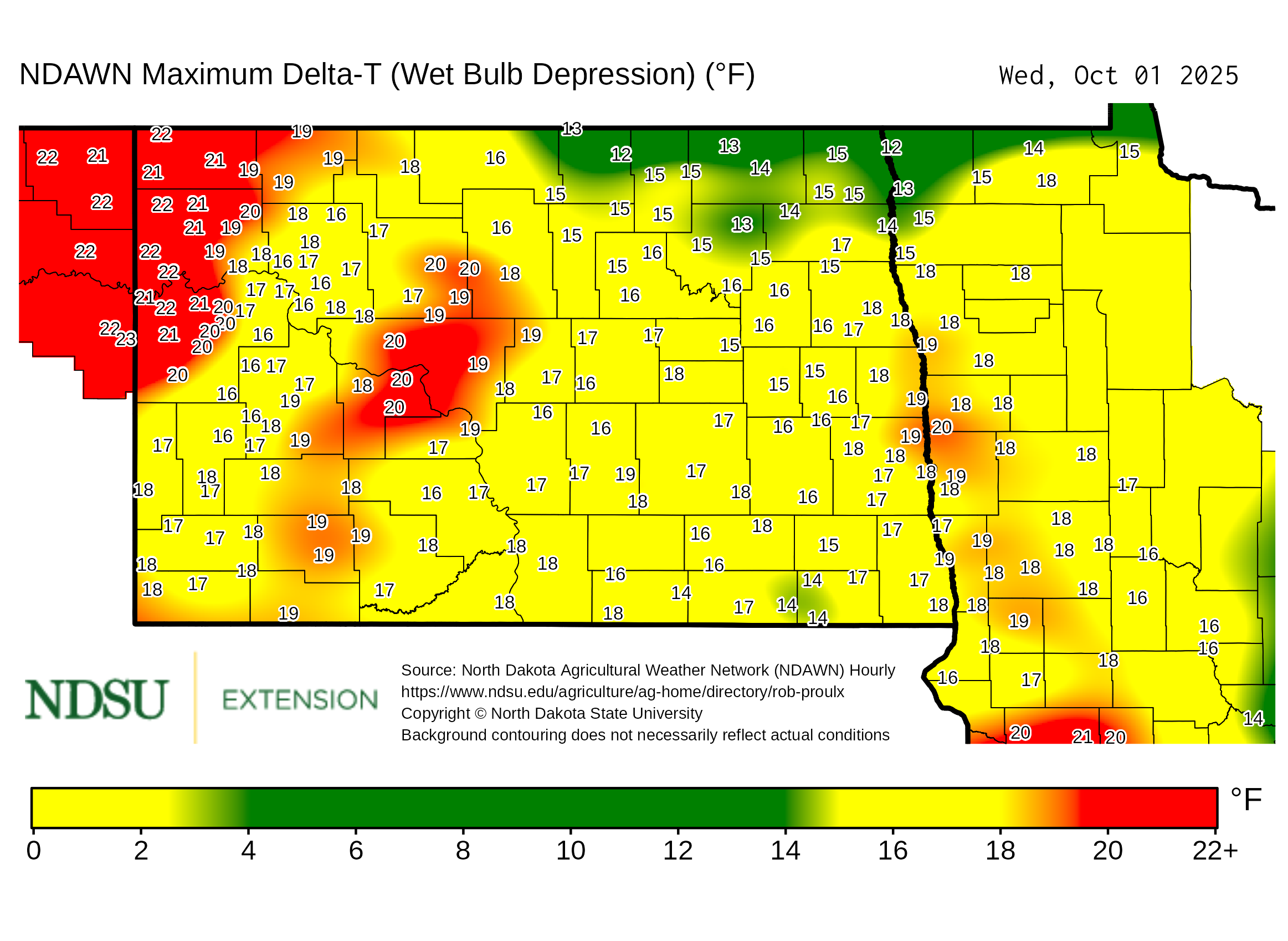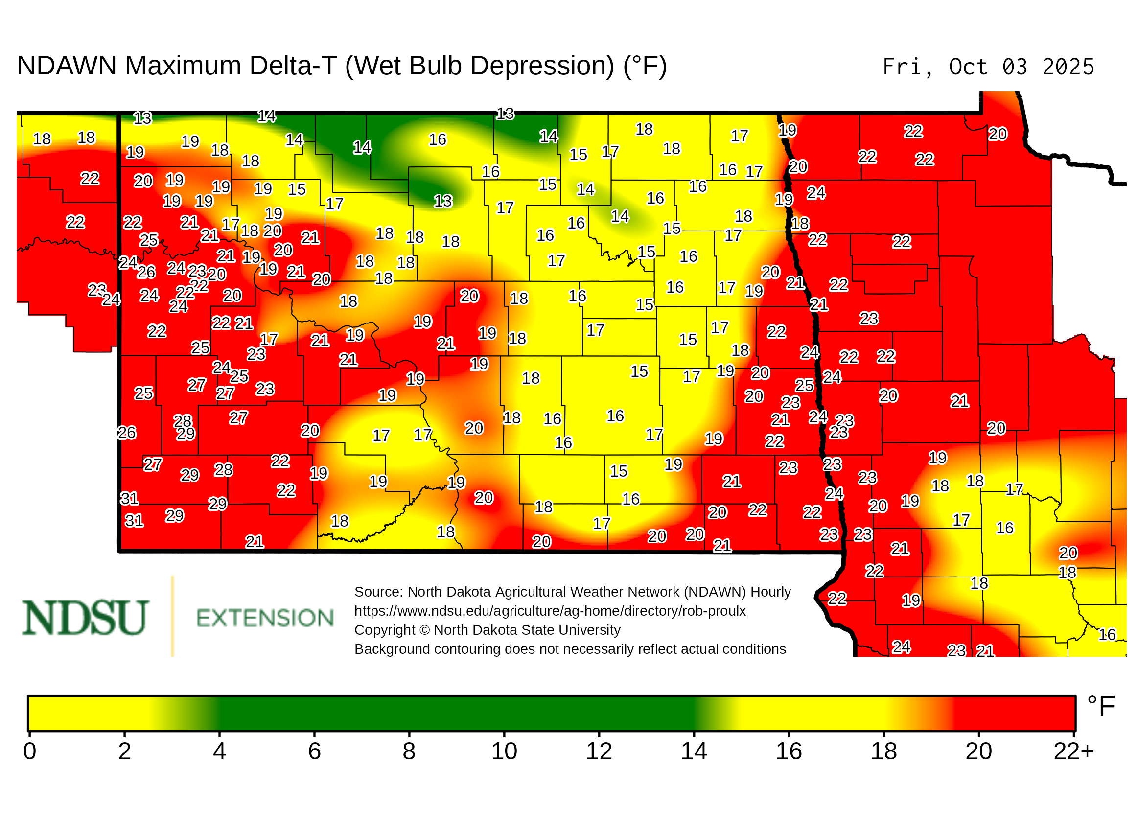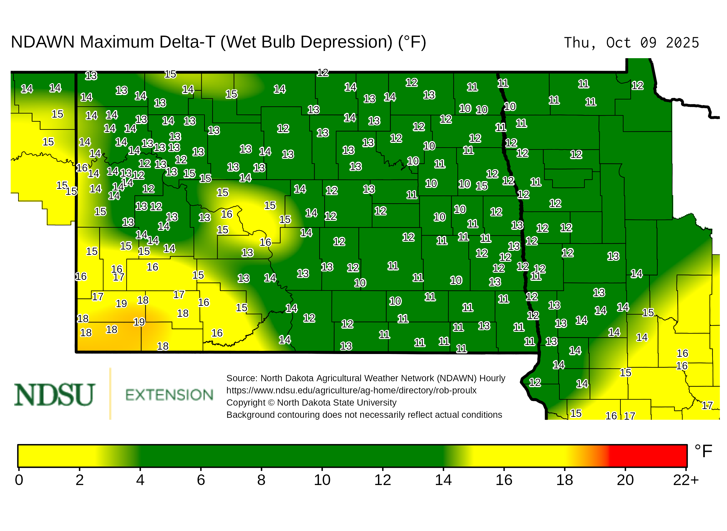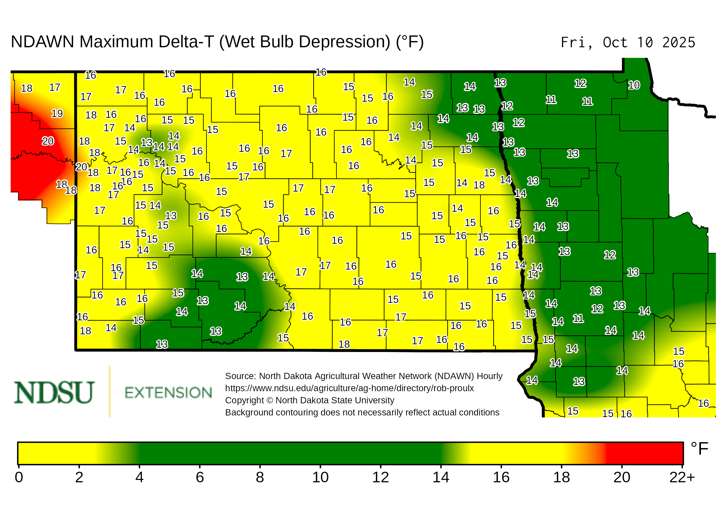 Historical maximum Delta T derived from North Dakota Agricultural Weather Network hourly data, which is available at