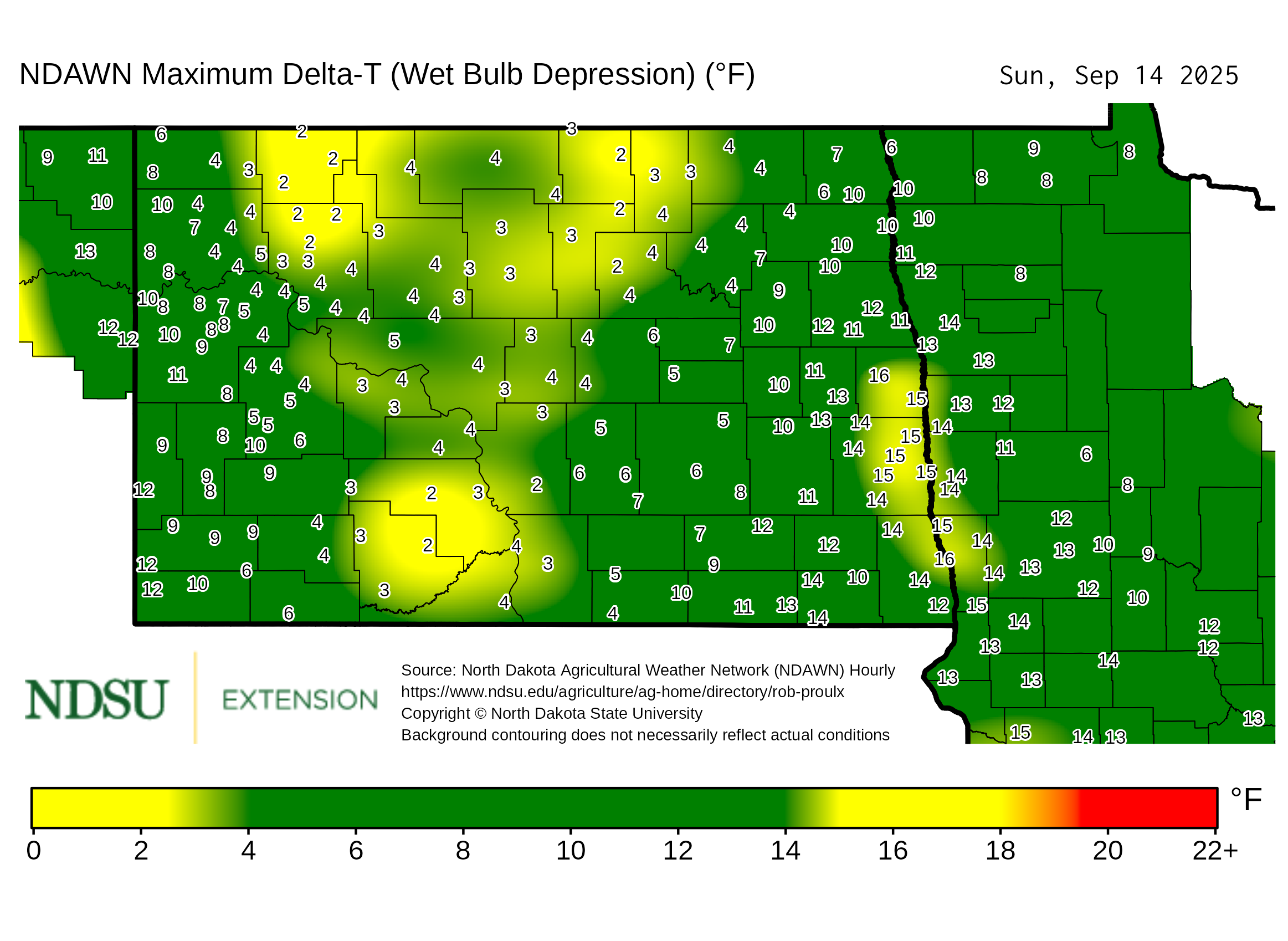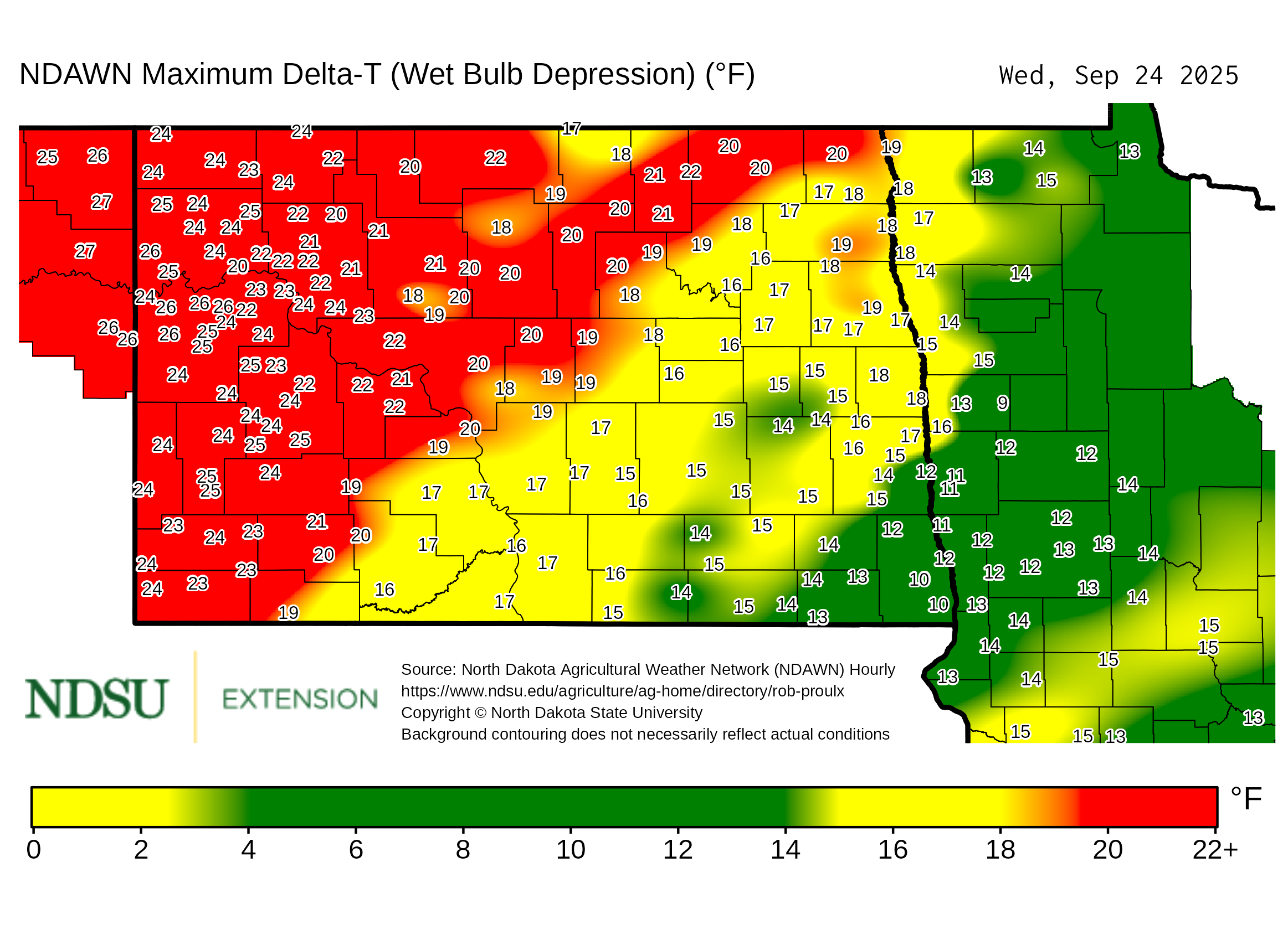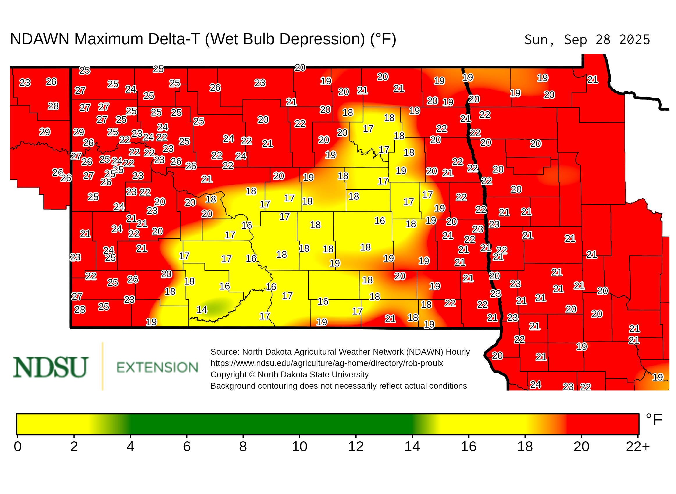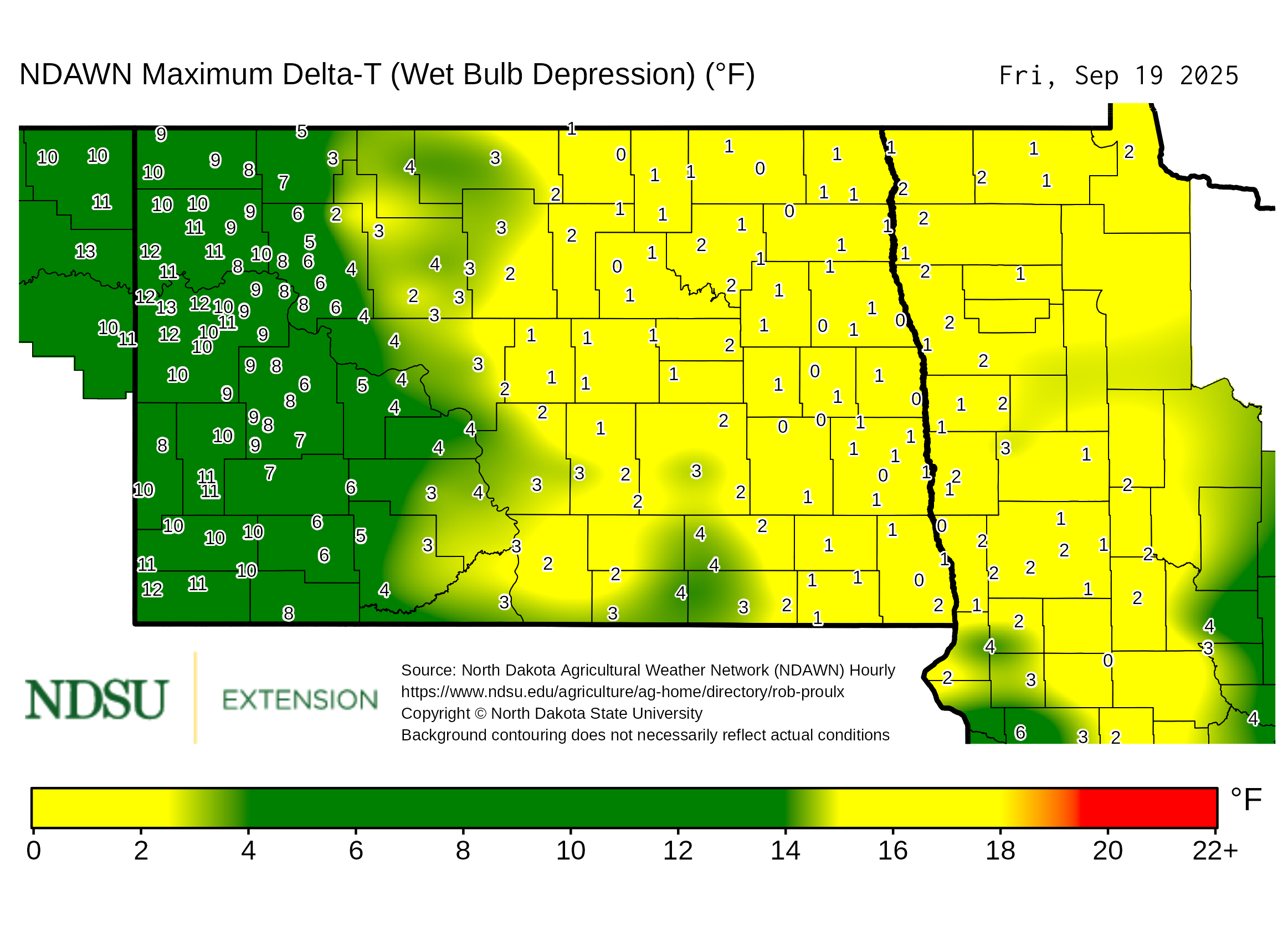 Historical maximum Delta T derived from North Dakota Agricultural Weather Network hourly data, which is available at