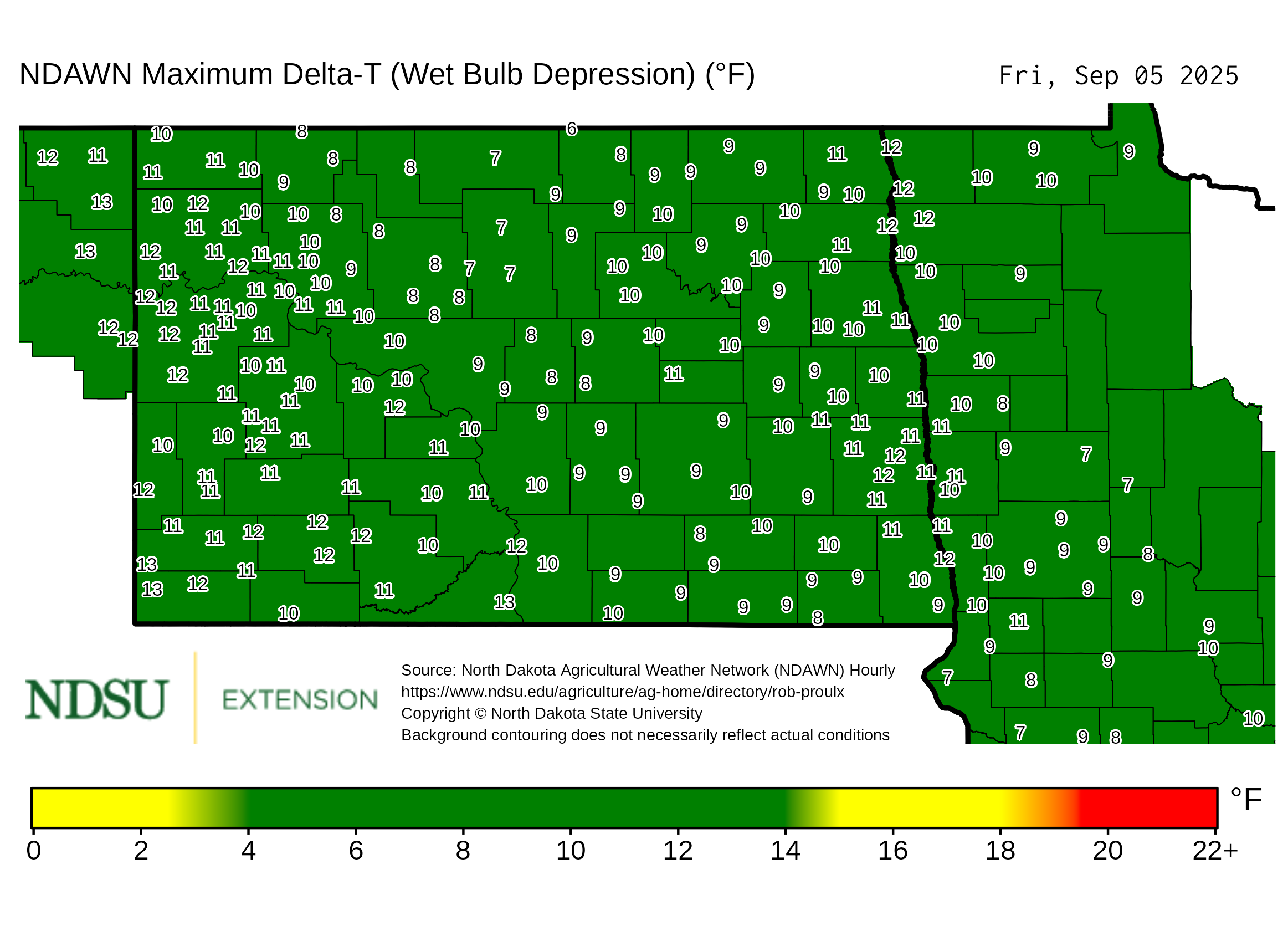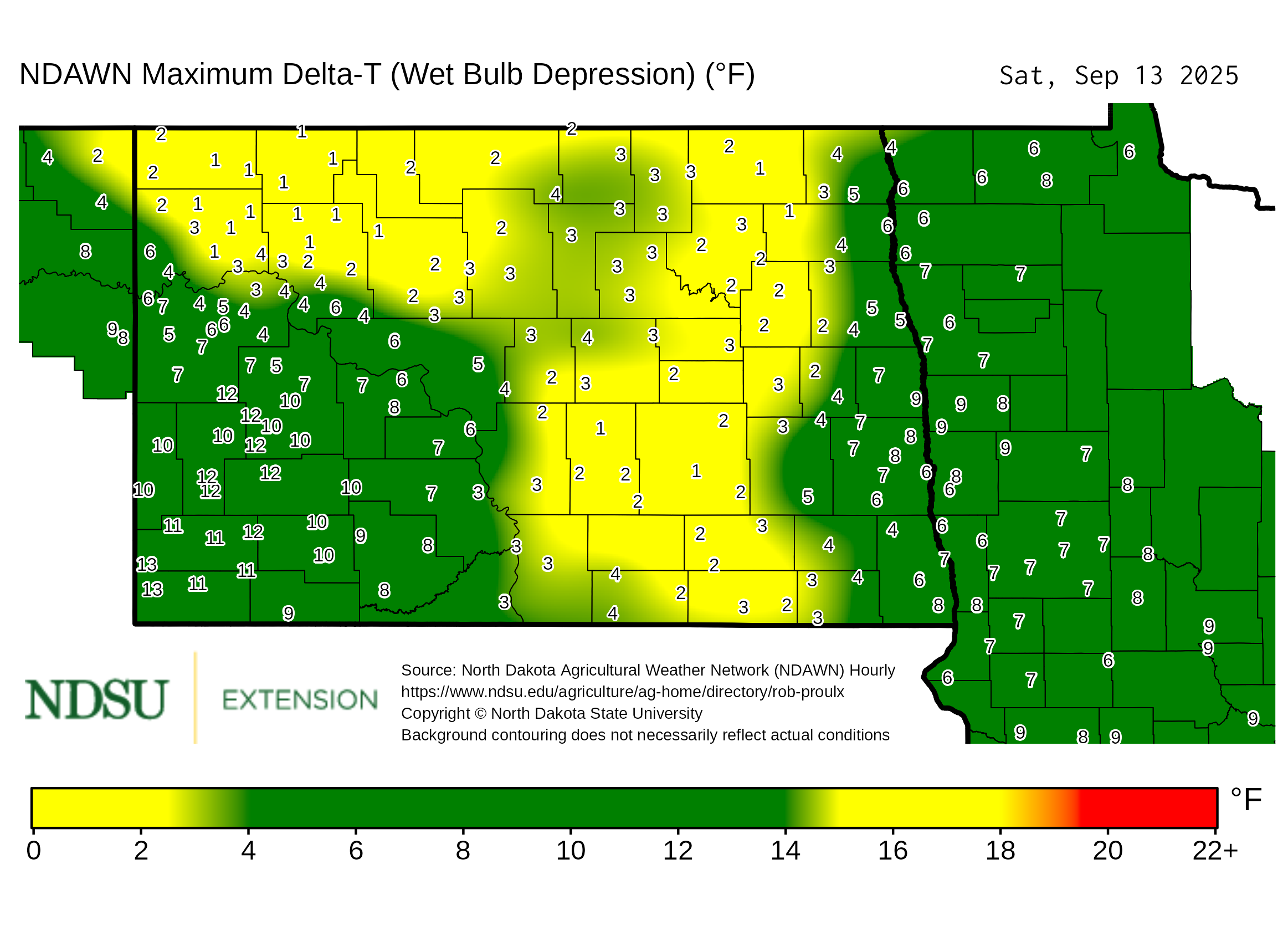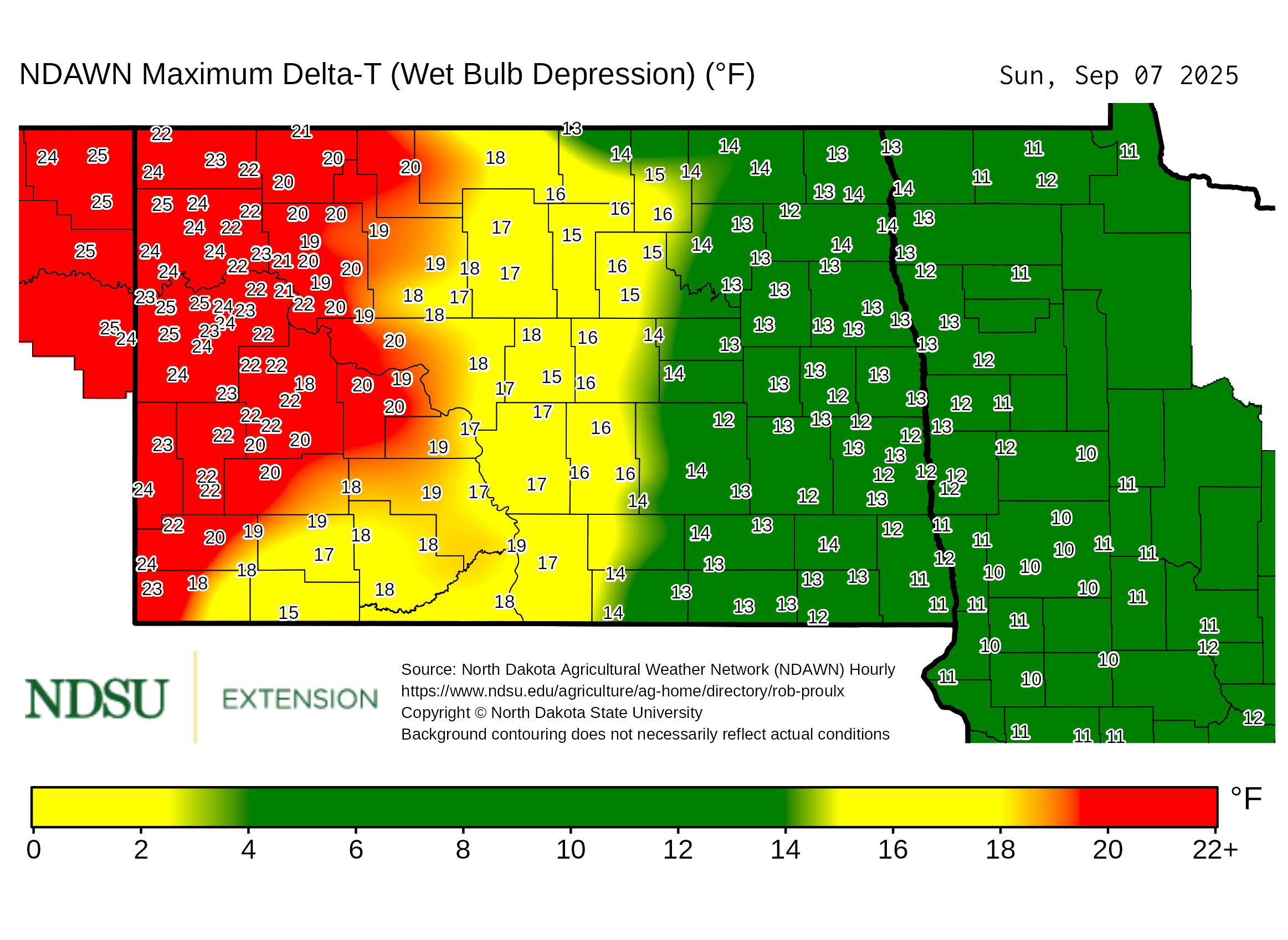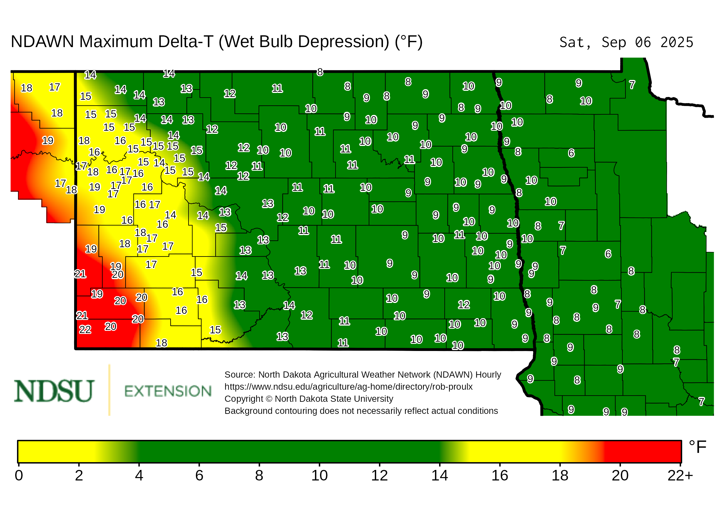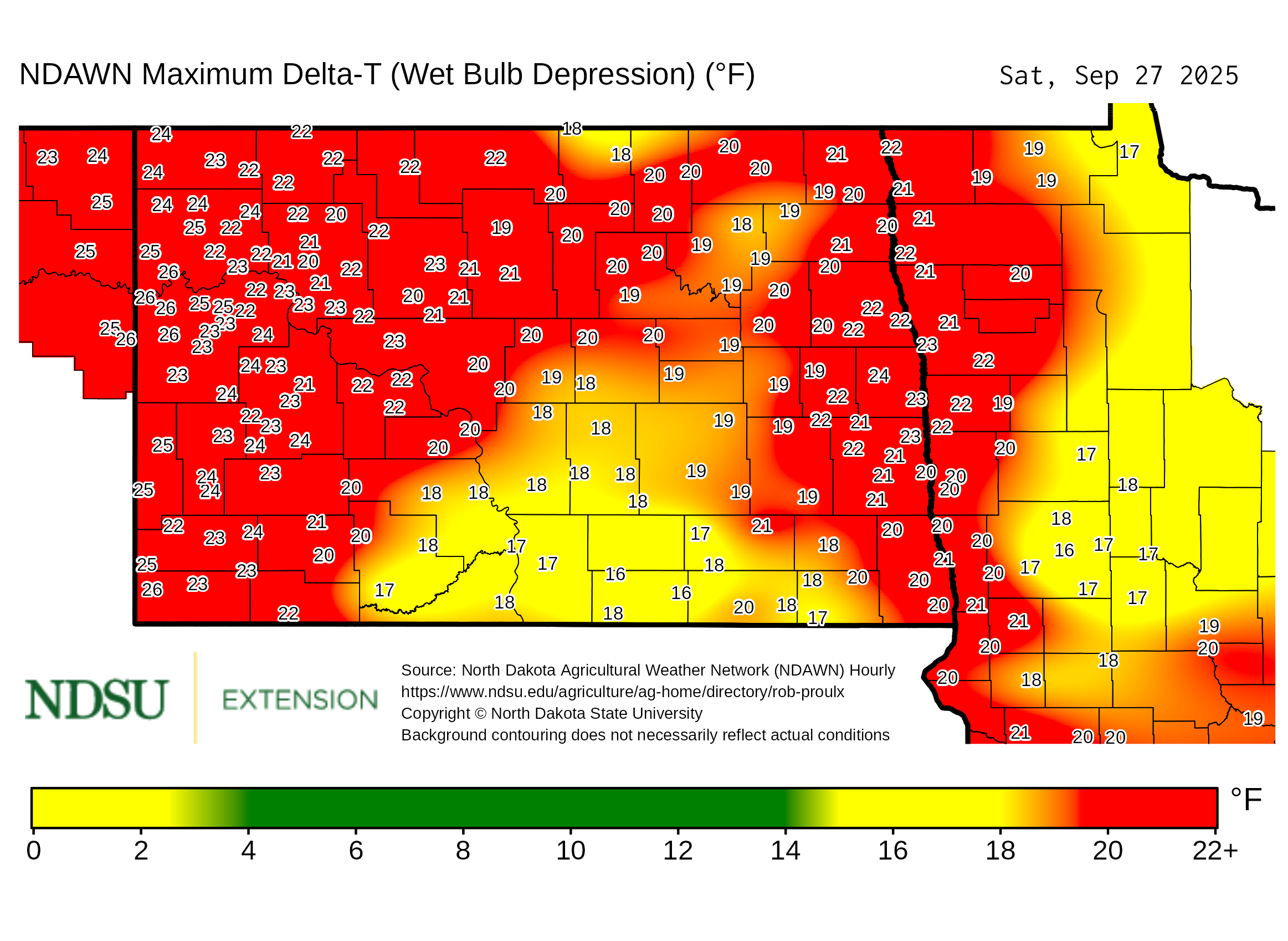 Historical maximum Delta T derived from North Dakota Agricultural Weather Network hourly data, which is available at