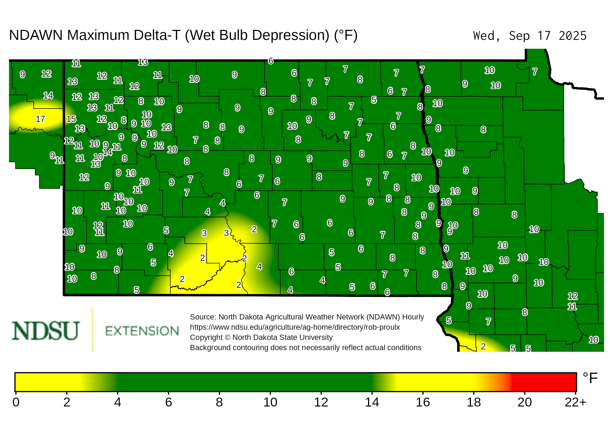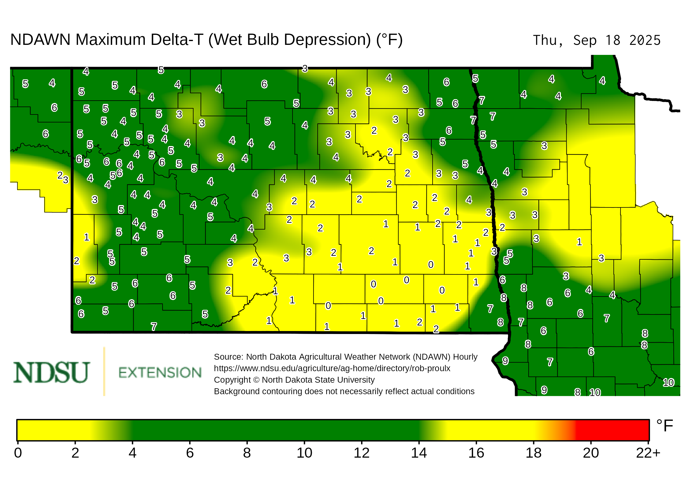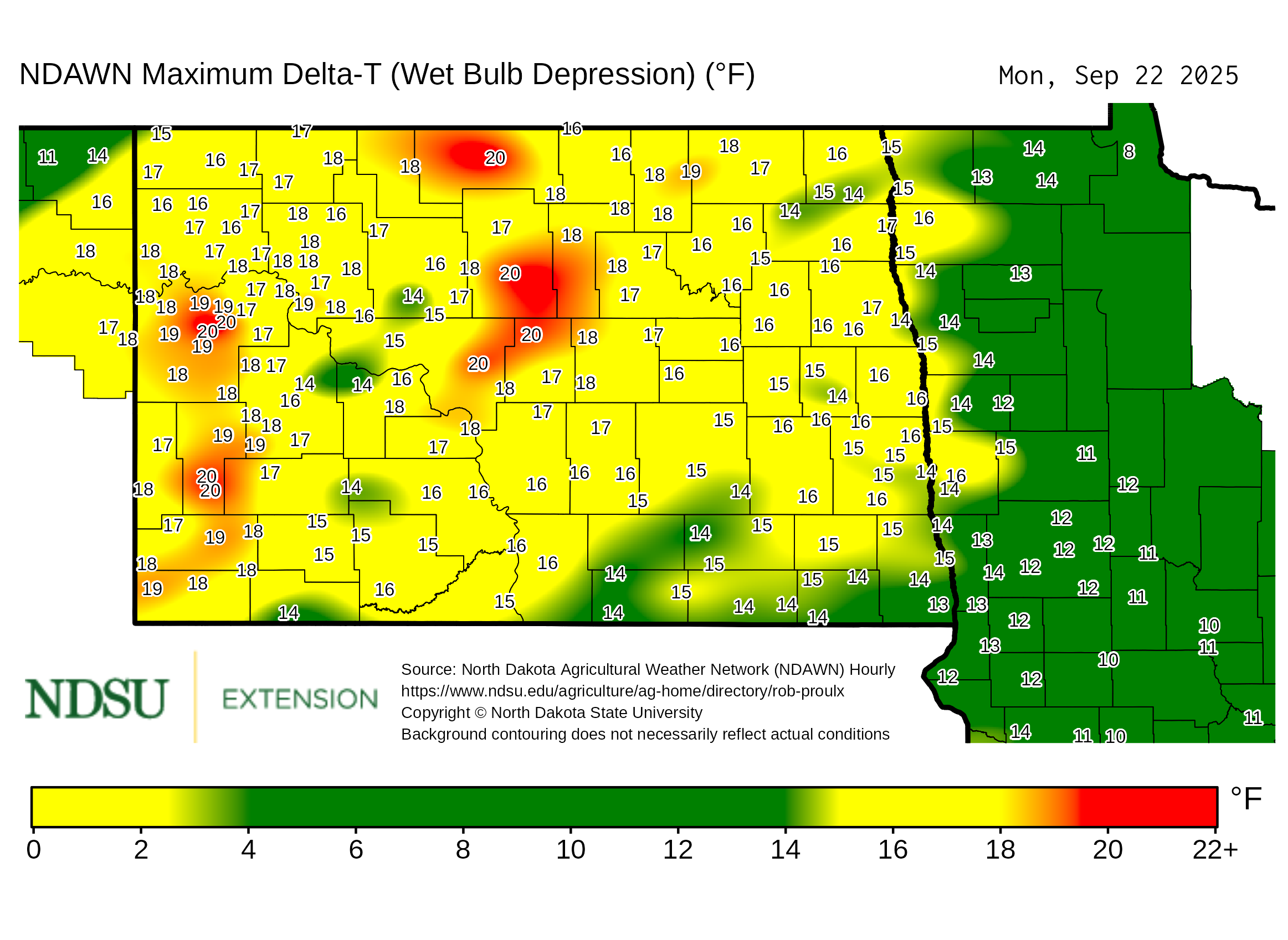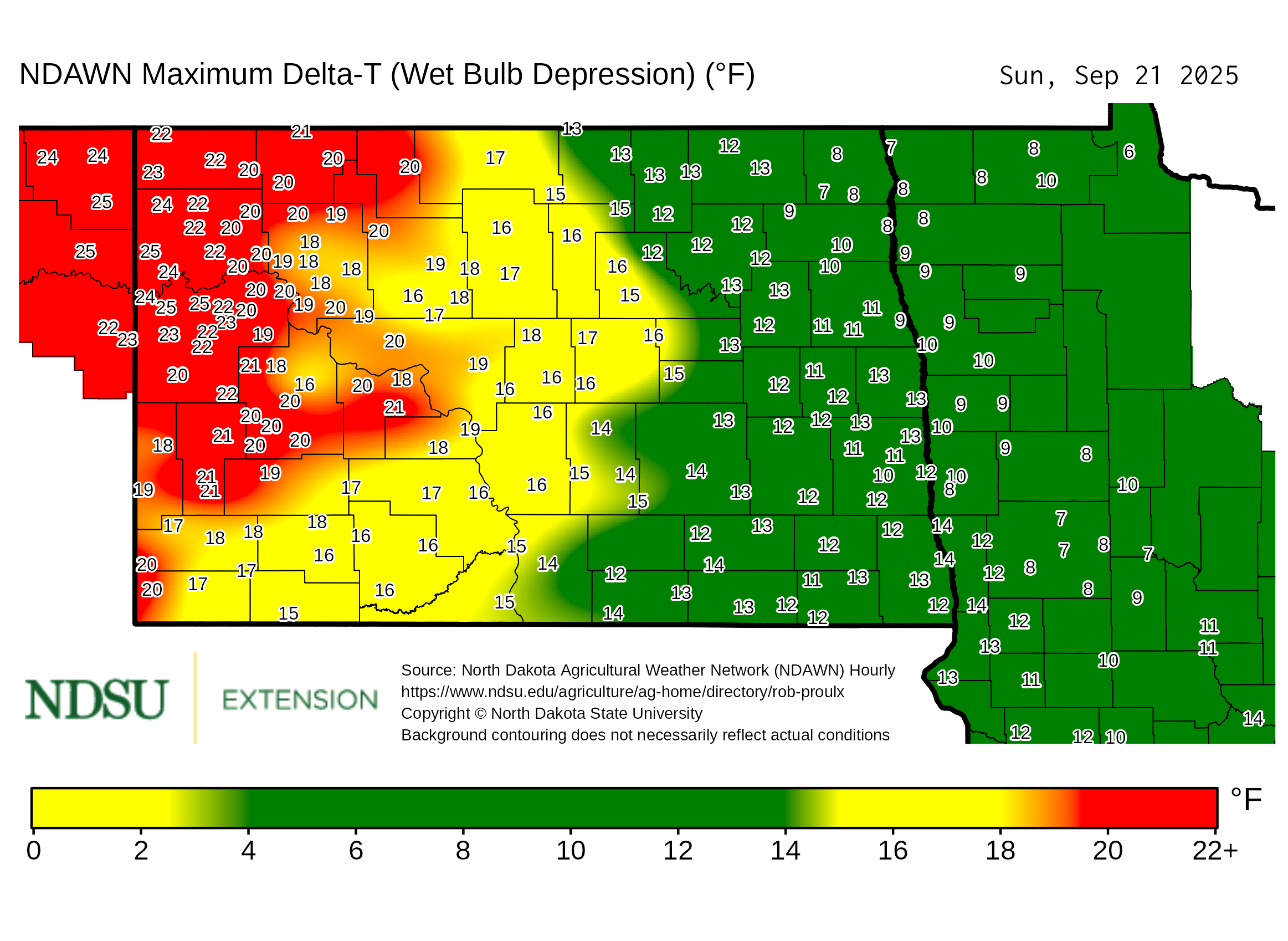 Historical maximum Delta T derived from North Dakota Agricultural Weather Network hourly data, which is available at