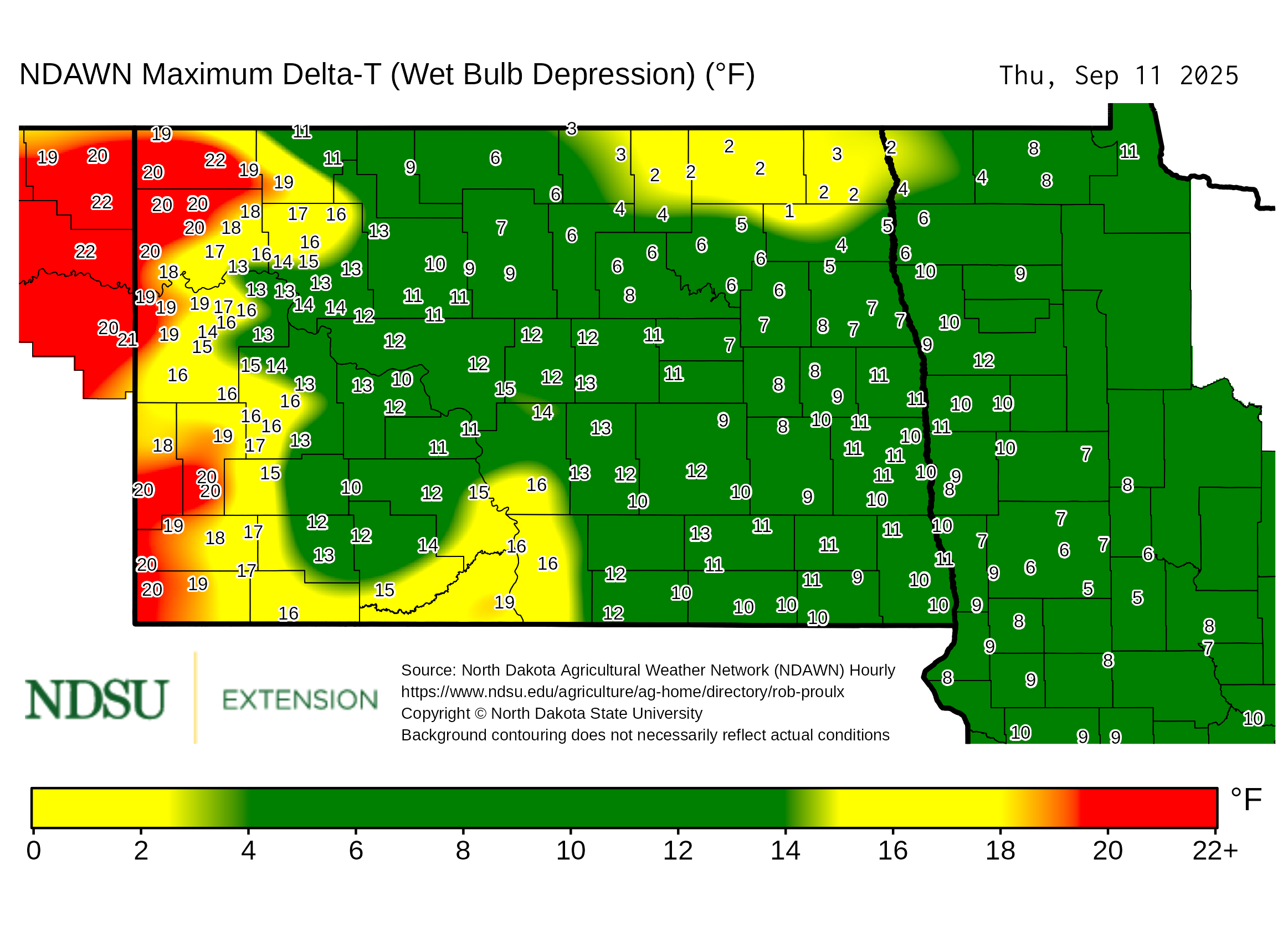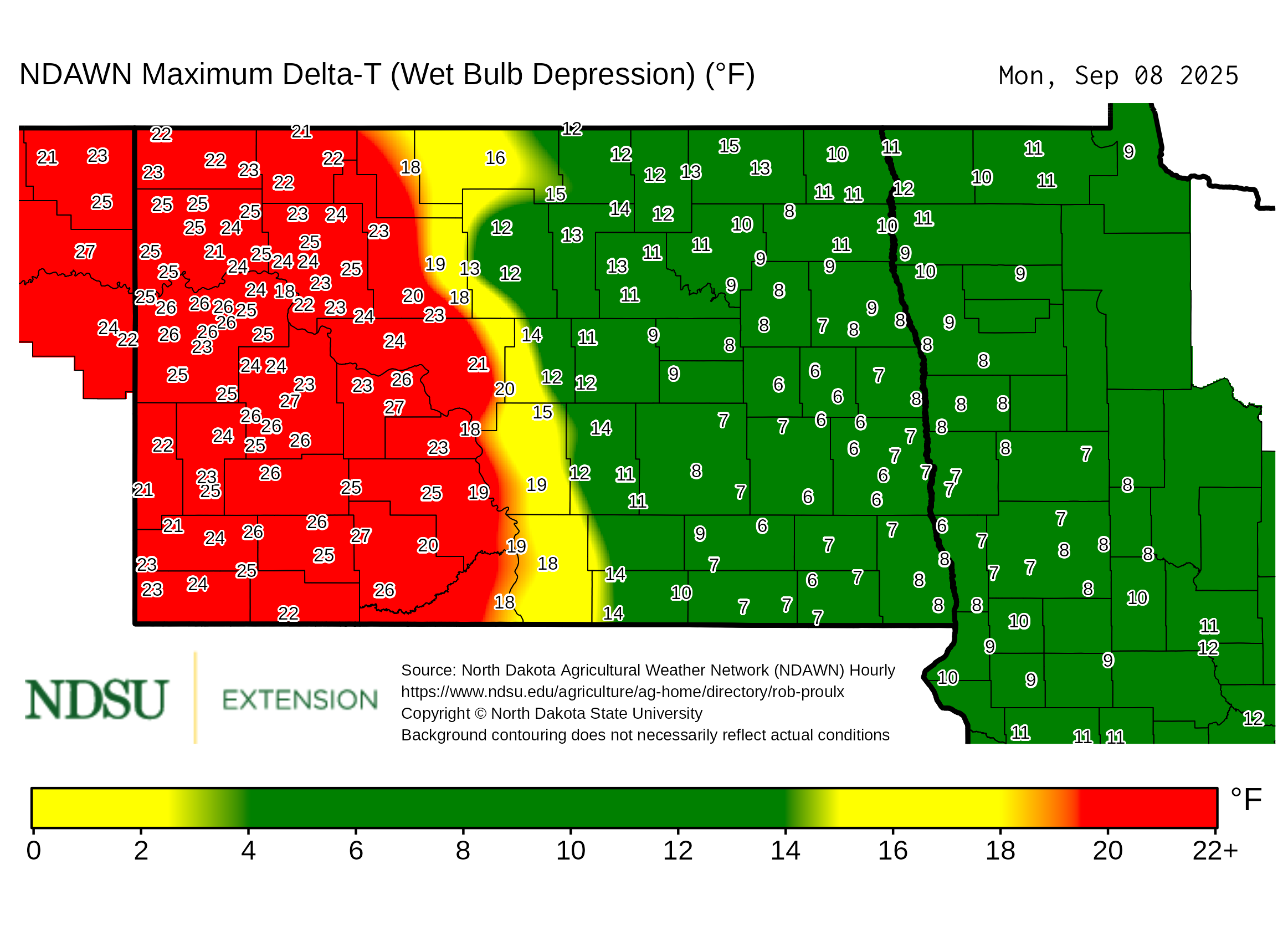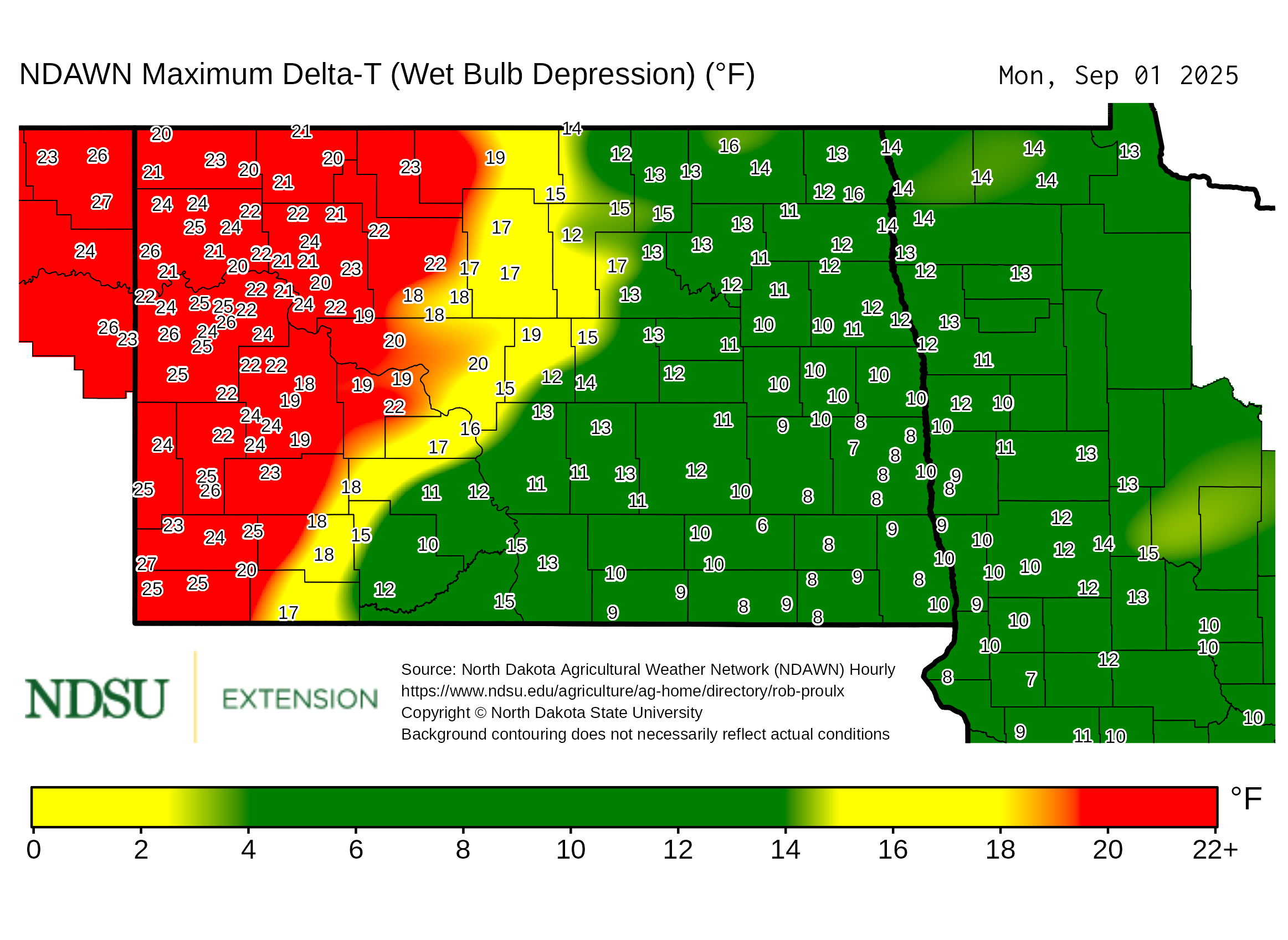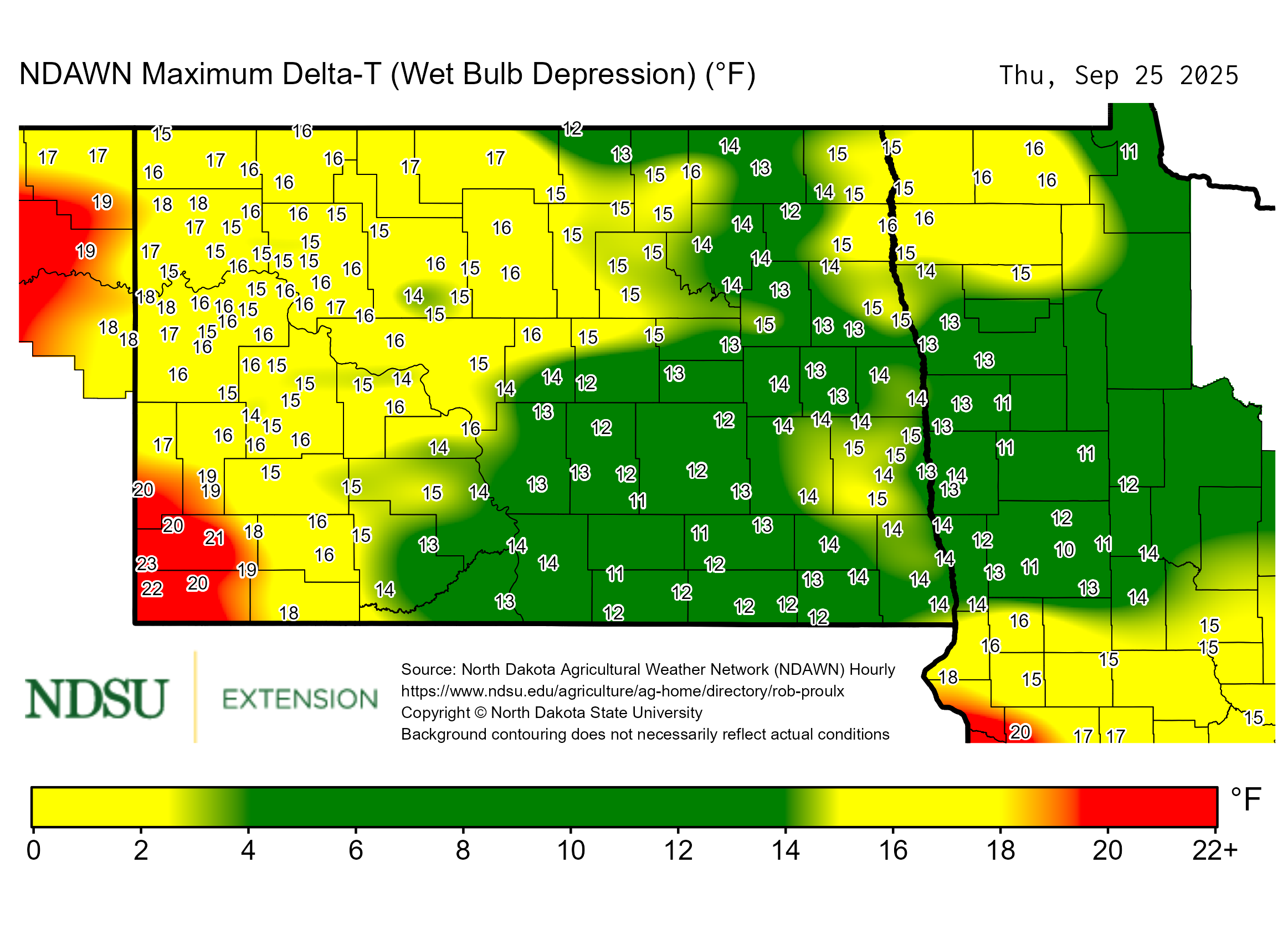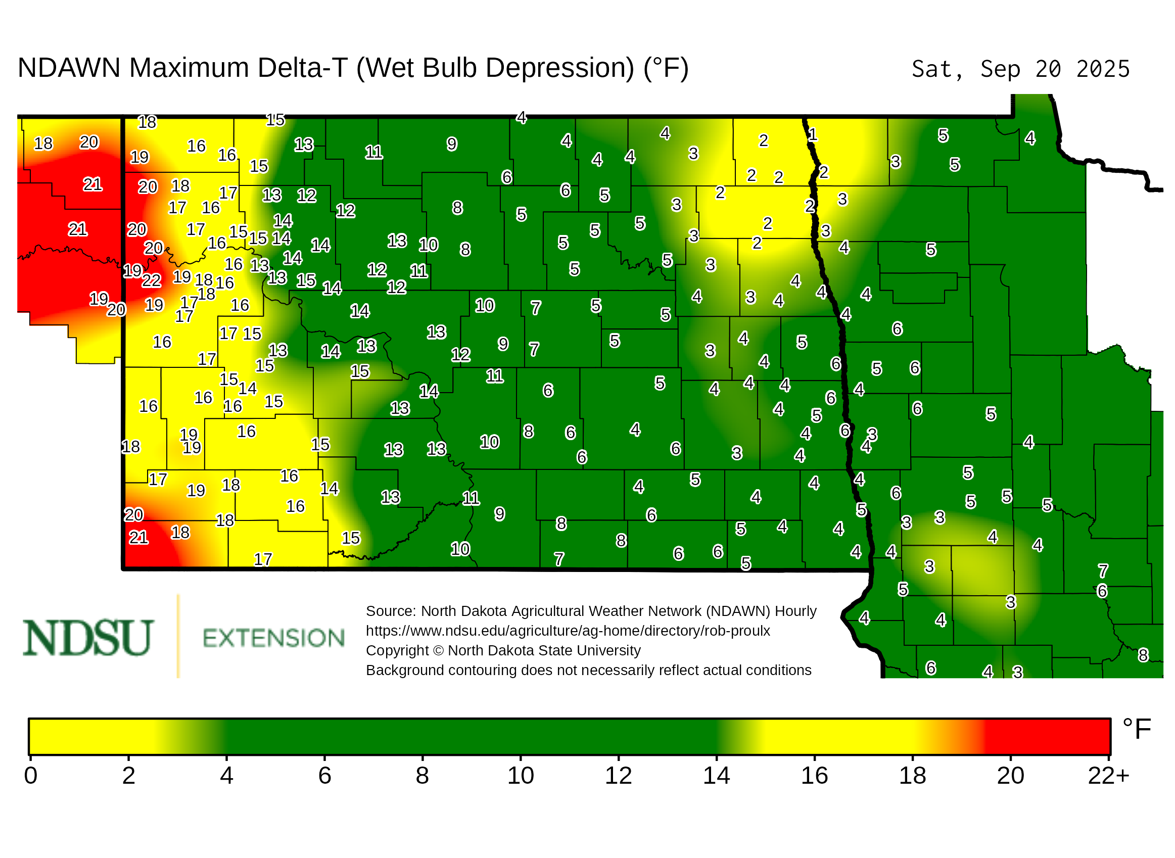 Historical maximum Delta T derived from North Dakota Agricultural Weather Network hourly data, which is available at