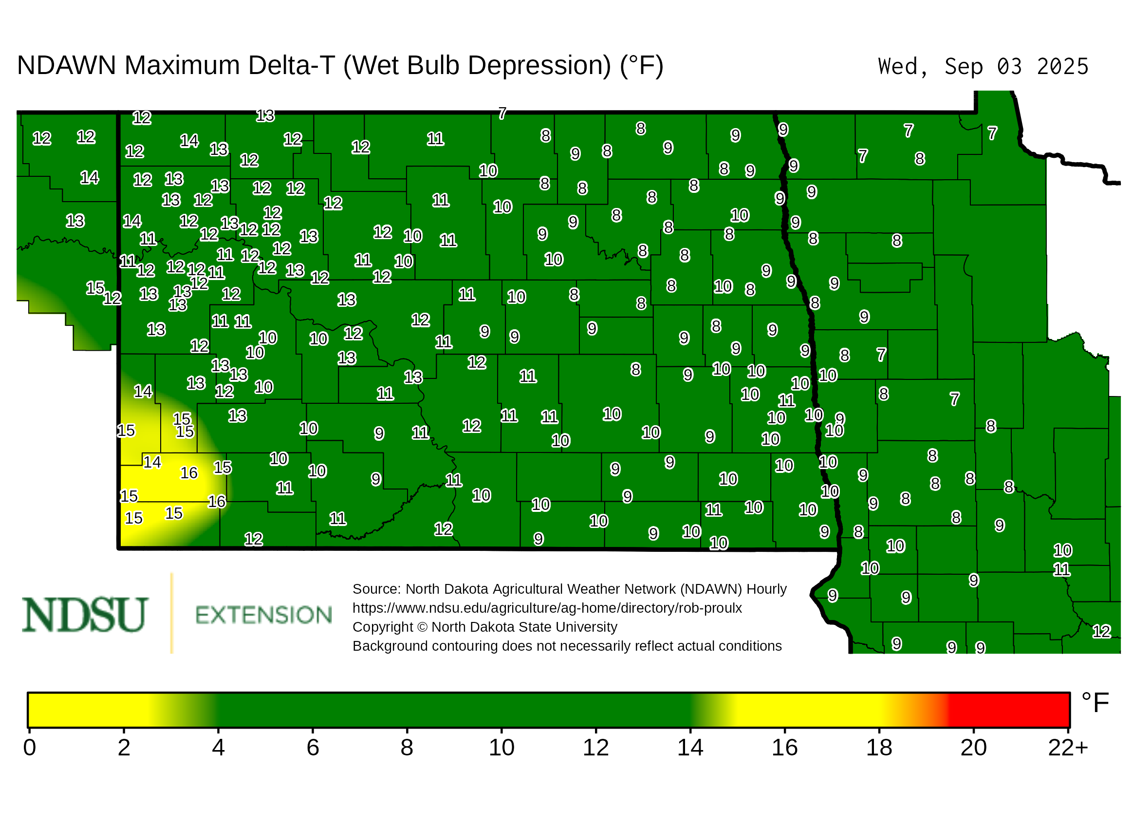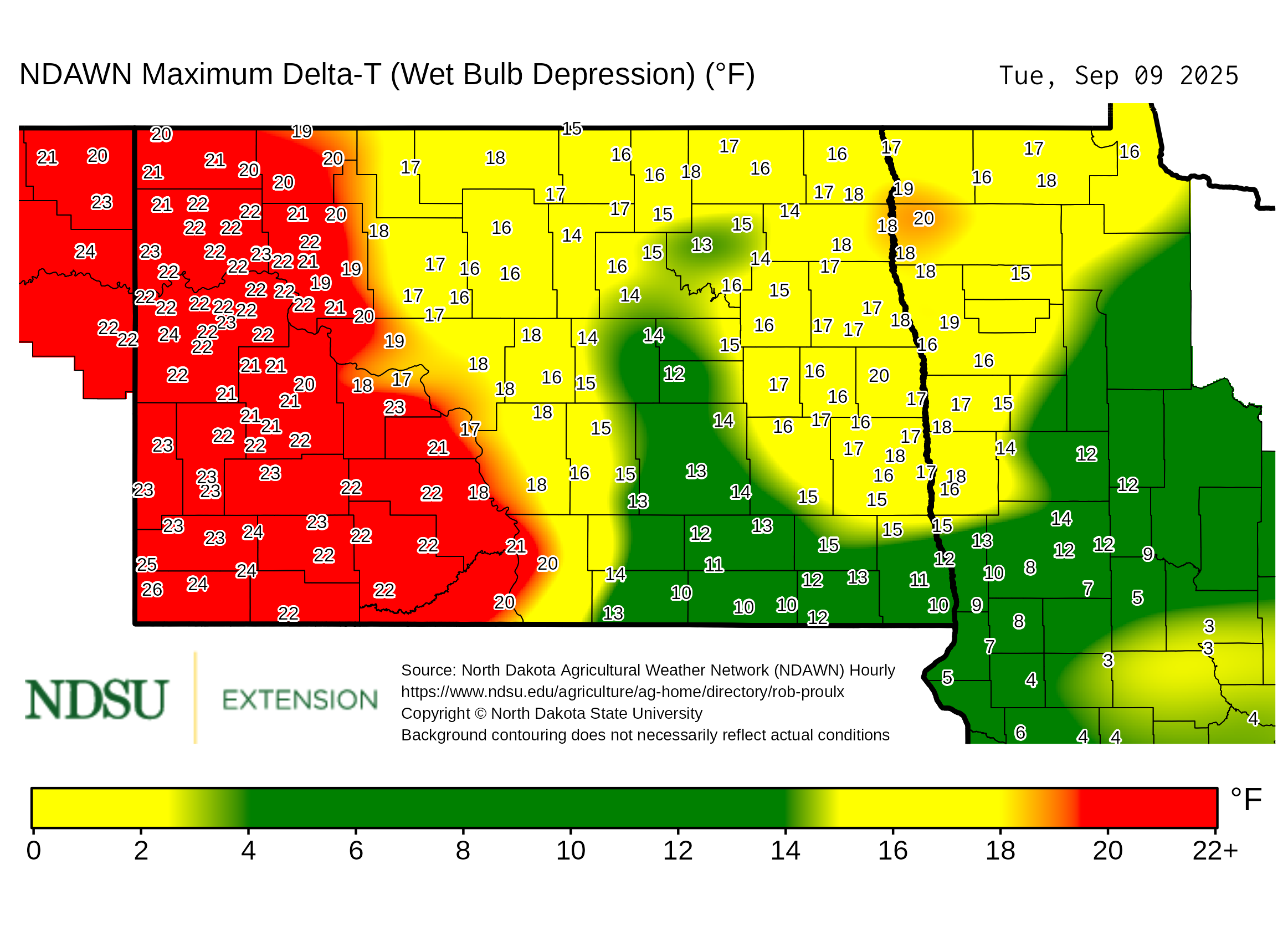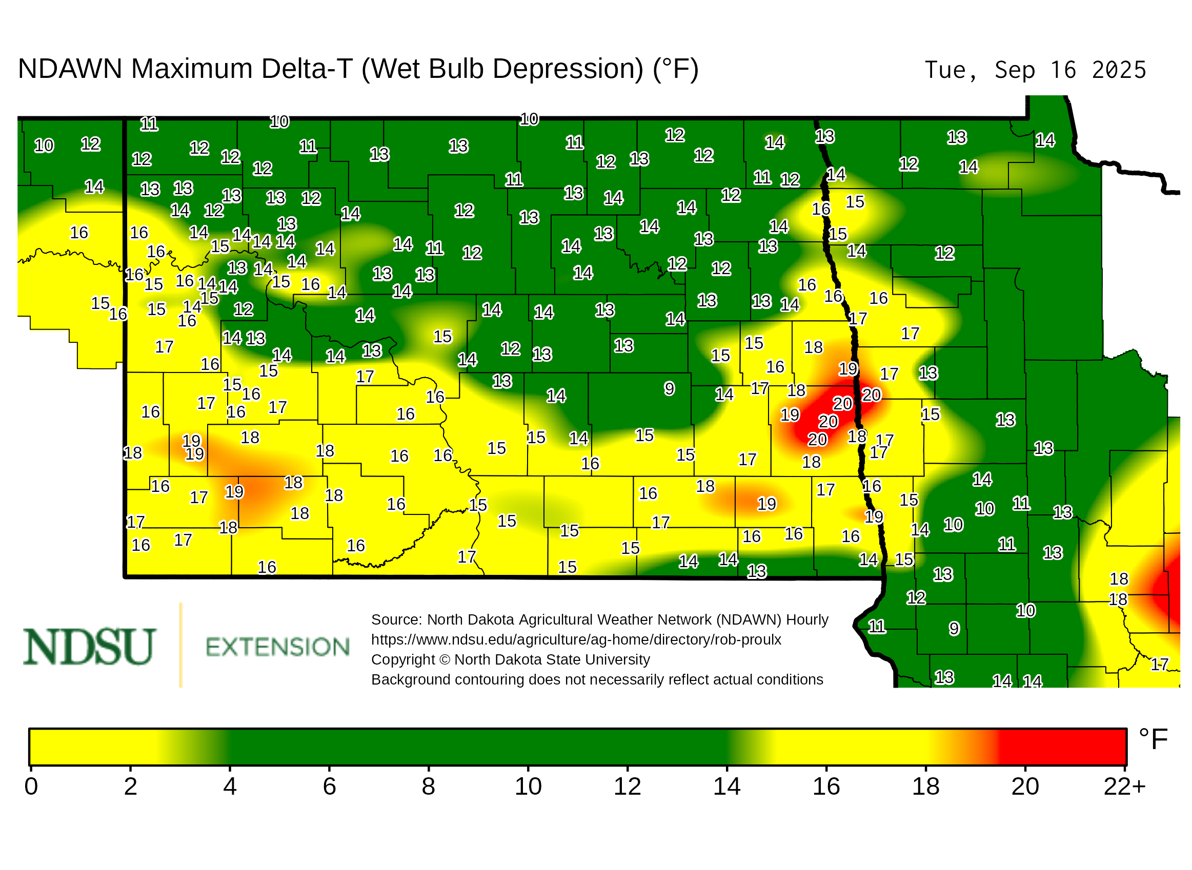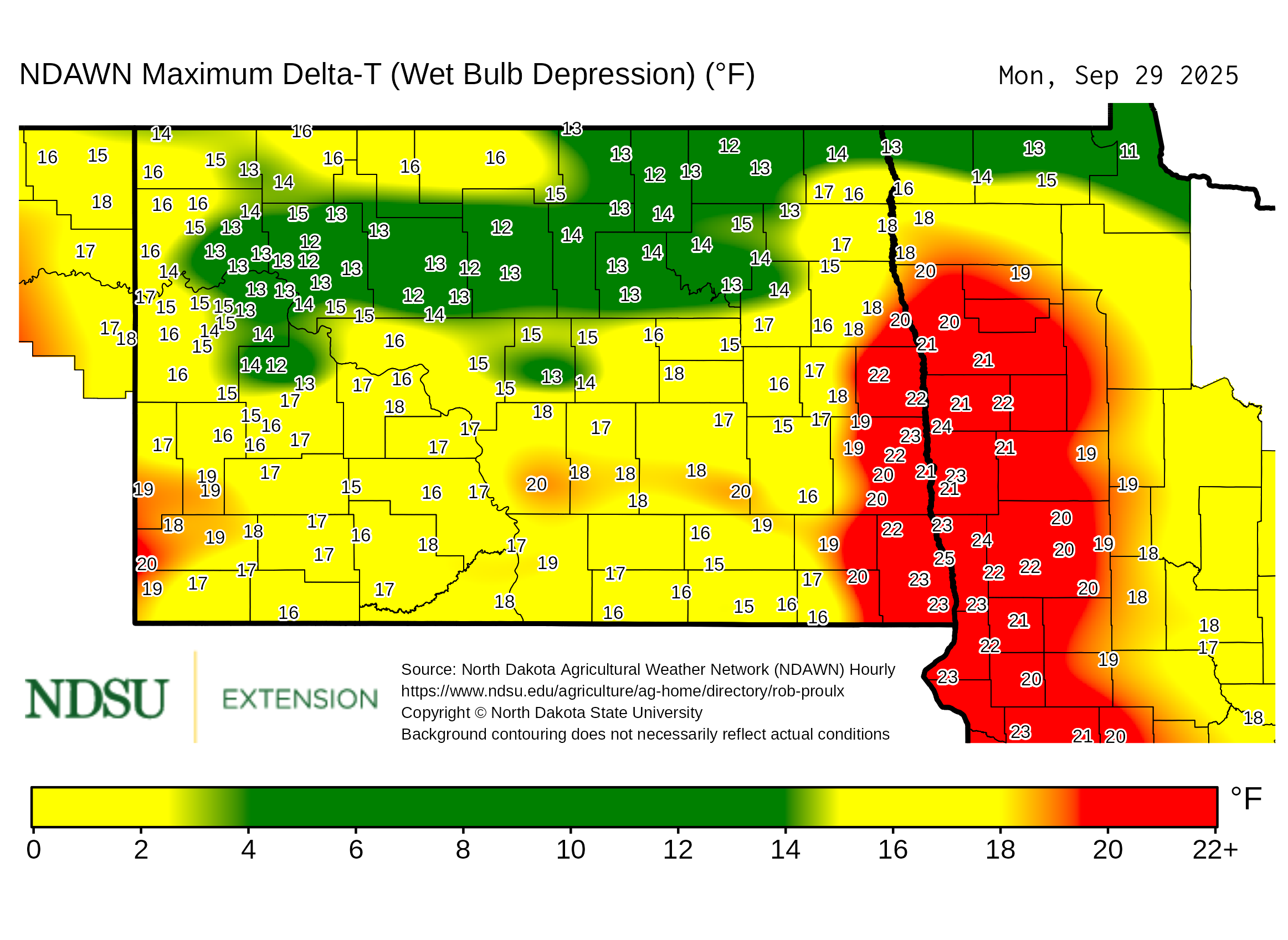 Historical maximum Delta T derived from North Dakota Agricultural Weather Network hourly data, which is available at