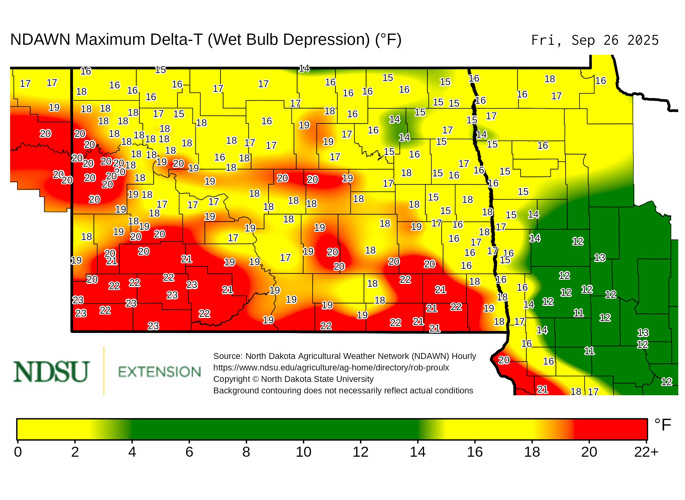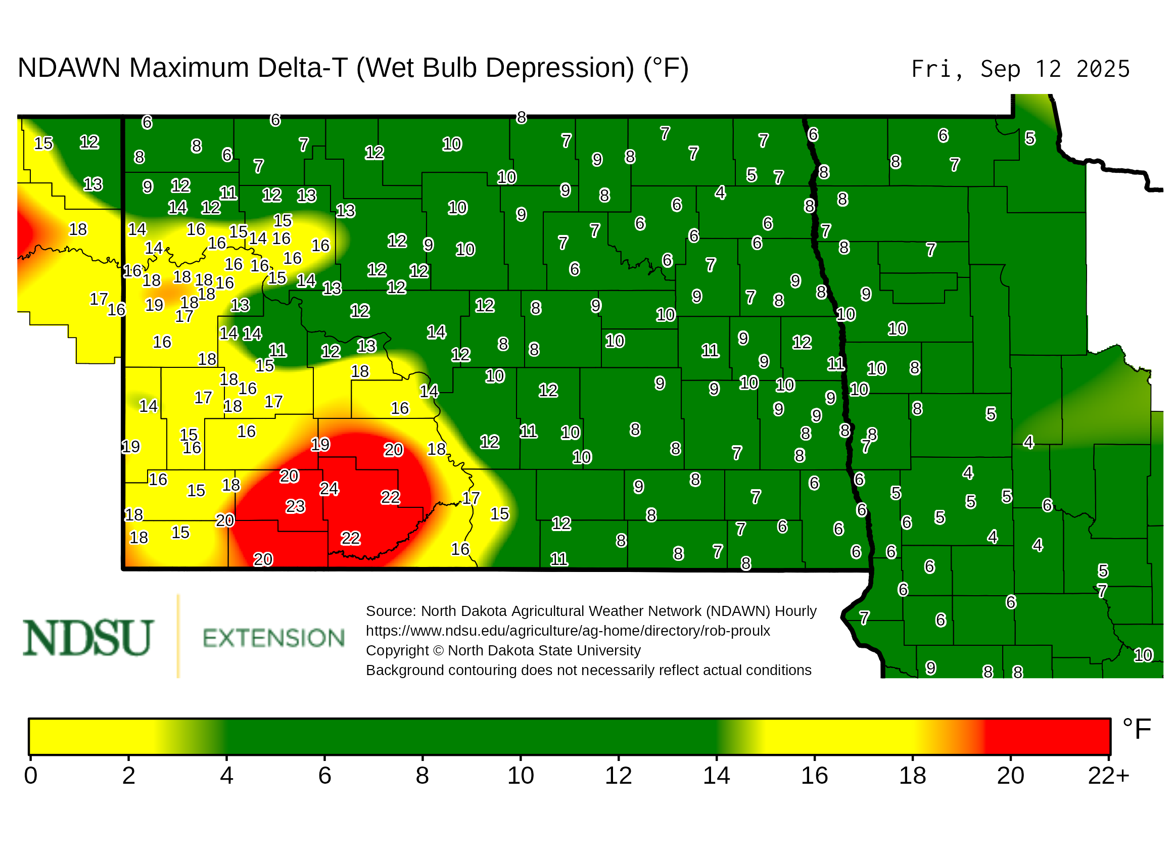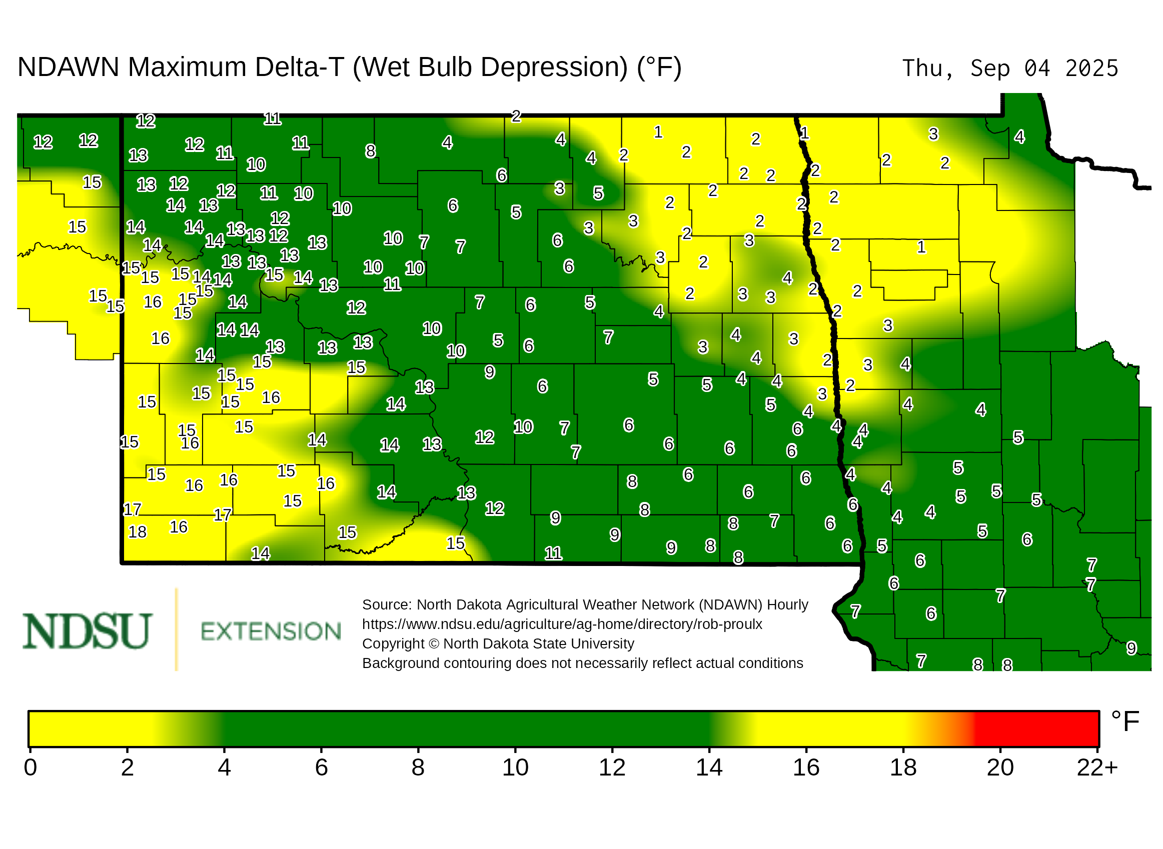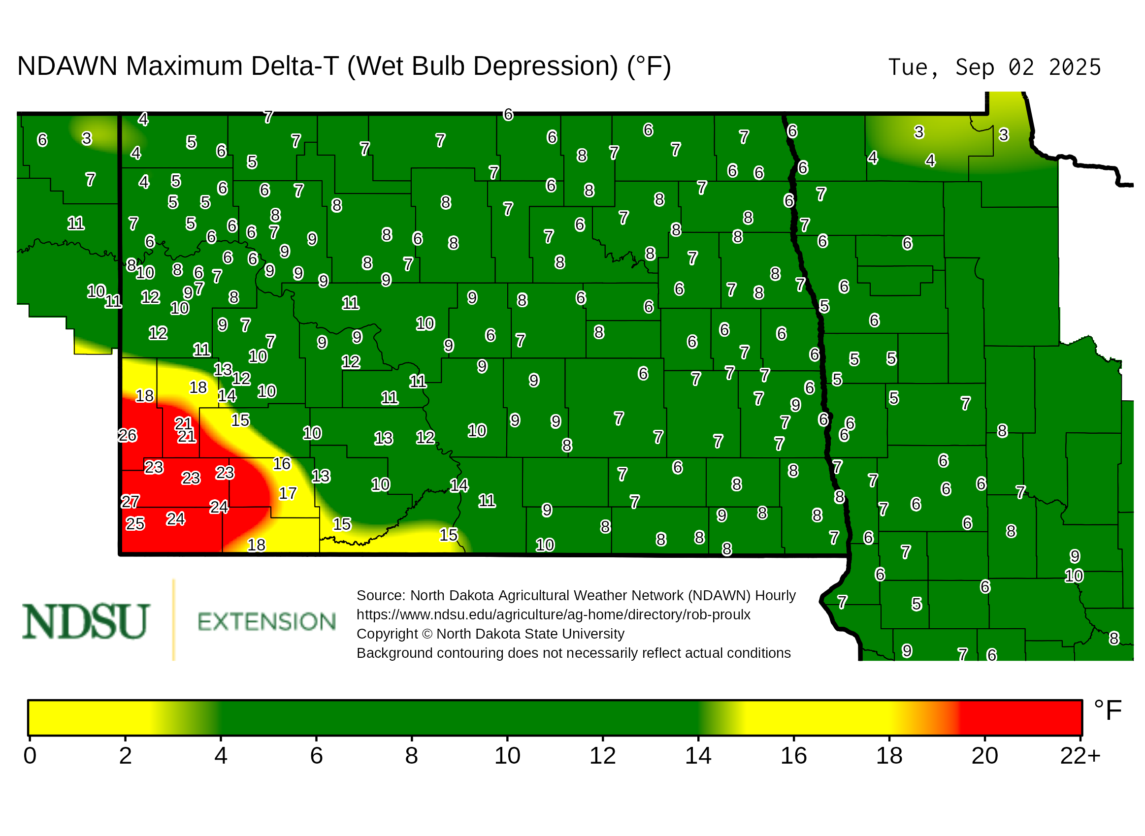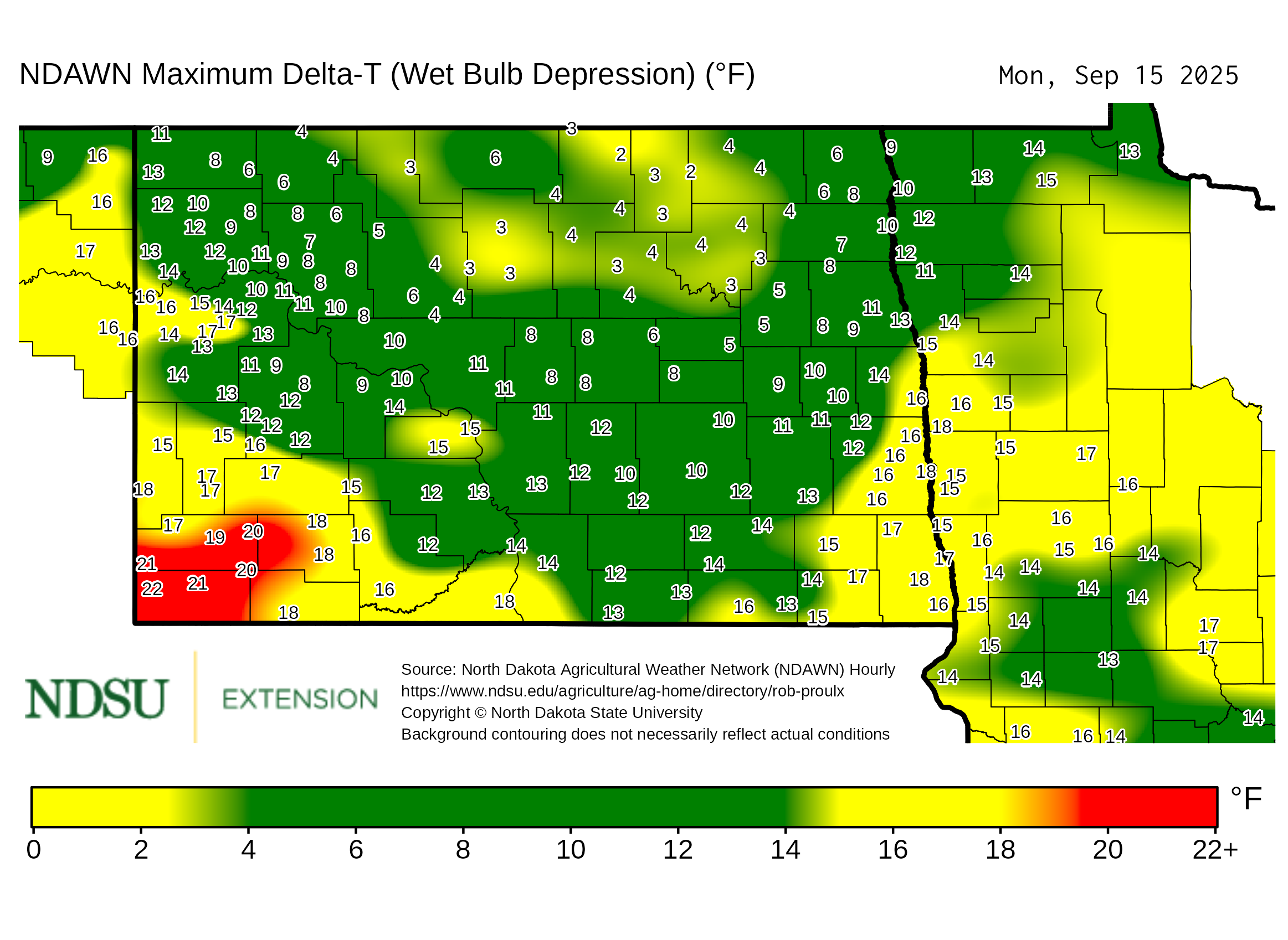 Historical maximum Delta T derived from North Dakota Agricultural Weather Network hourly data, which is available at